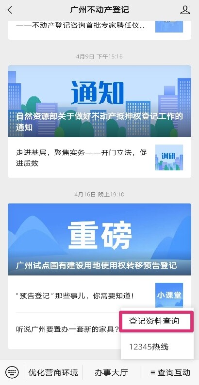 第一步,打开“广州不动产登记”微信公众号,选择“查询互动”栏目的“登记资料查询”。