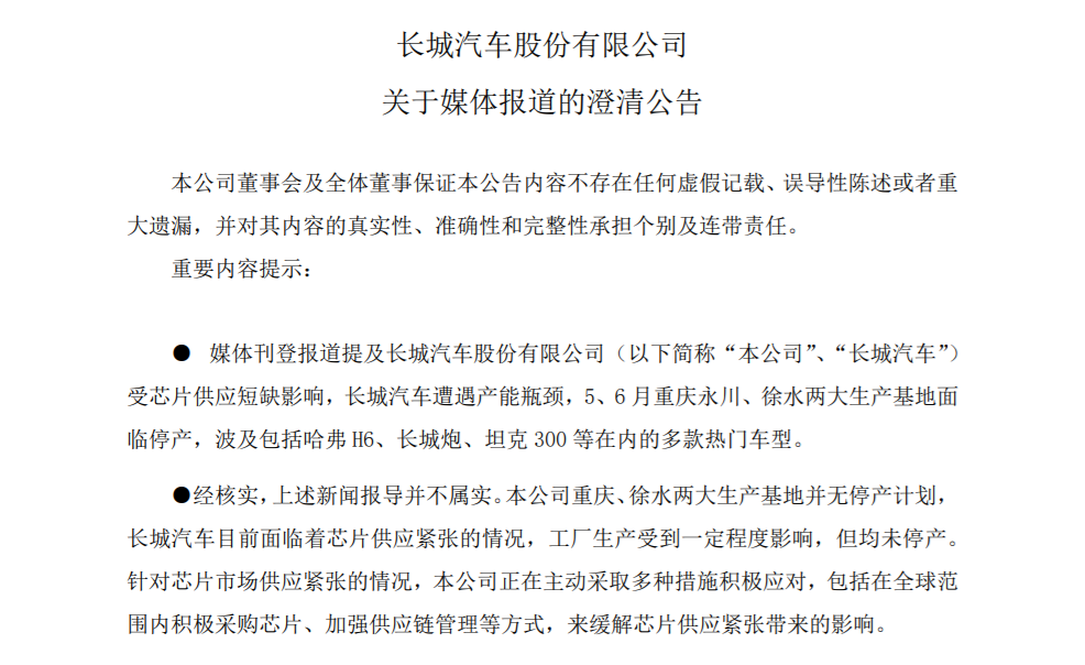 4月25日,长城汽车发布澄清公告称,长城汽车重庆、徐水两大生产基地并无停产计划,长城汽车目前面临着芯片供应紧张的情况,工厂生产受到一定程度影响,但均未停产。