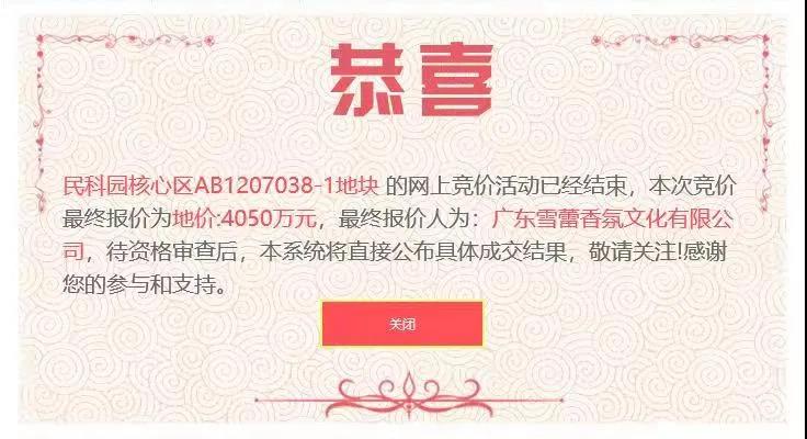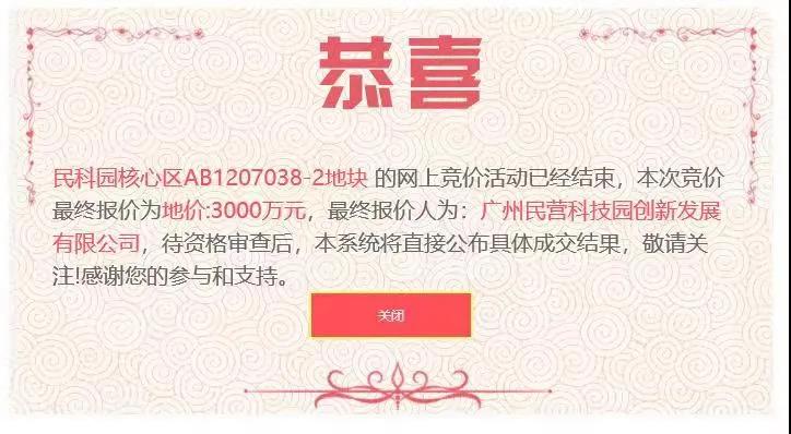 4月23日,广州民营科技园范围内的三宗一类工业用地成功出让,包括核心区AB1207038-1地块、AB1207038-2地块和广州轨道交通装备产业园AB0105102-1地块,竞得人为广东雪蕾香氛文化有限公司、广州民营科技园创新发展有限公司和广州民科园投资有限公司。