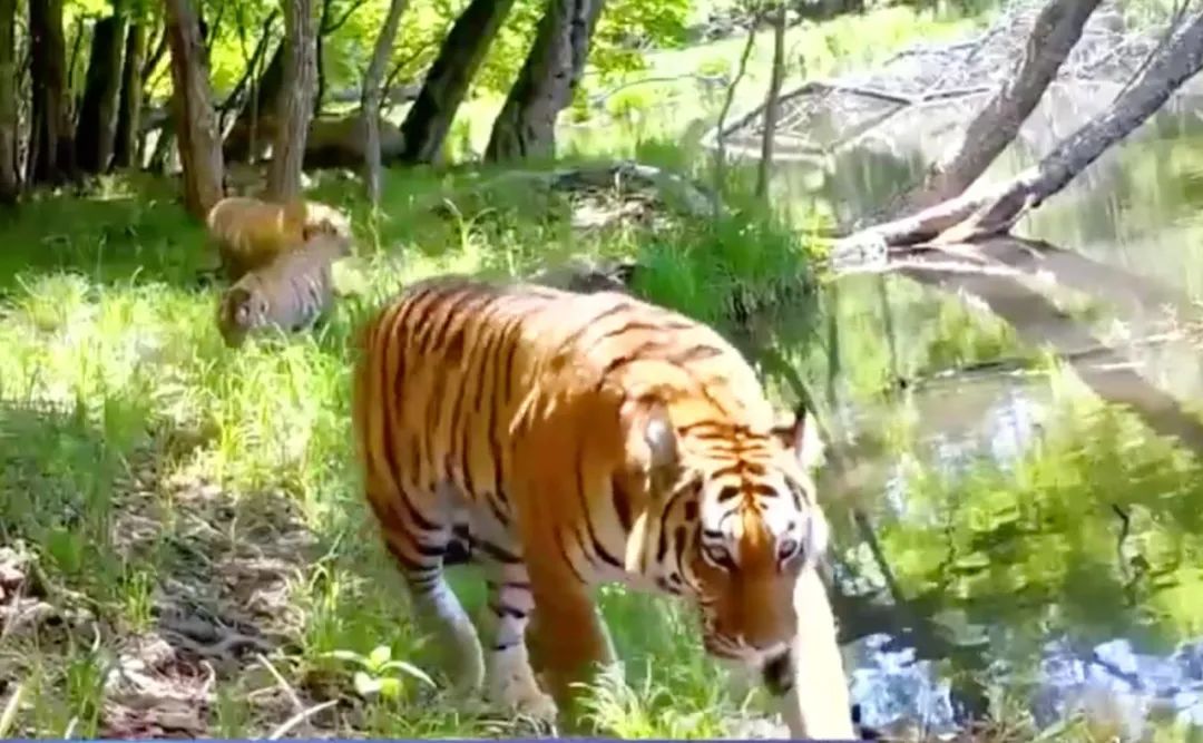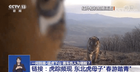 猛虎频频下山近几年,随着生态环境越来越好,老虎时常出没。本月中旬,吉林省珲春市东北虎豹国家公园监测系统就拍到了一只东北虎妈妈,带着三个虎娃巡山的视频,这也是目前监测到的最新东北虎家族。