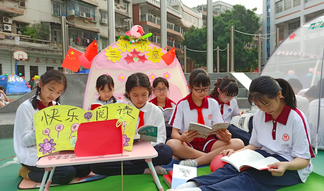 活动中,学生们浩浩荡荡地从教室里出来,走到自己搭好的小书窝前,随着校长的号召,同学们安静地盘腿而坐,每人手捧一本红色书籍,有《红岩》《铁道游击队》《小英雄雨来》等,认真地阅读起来。