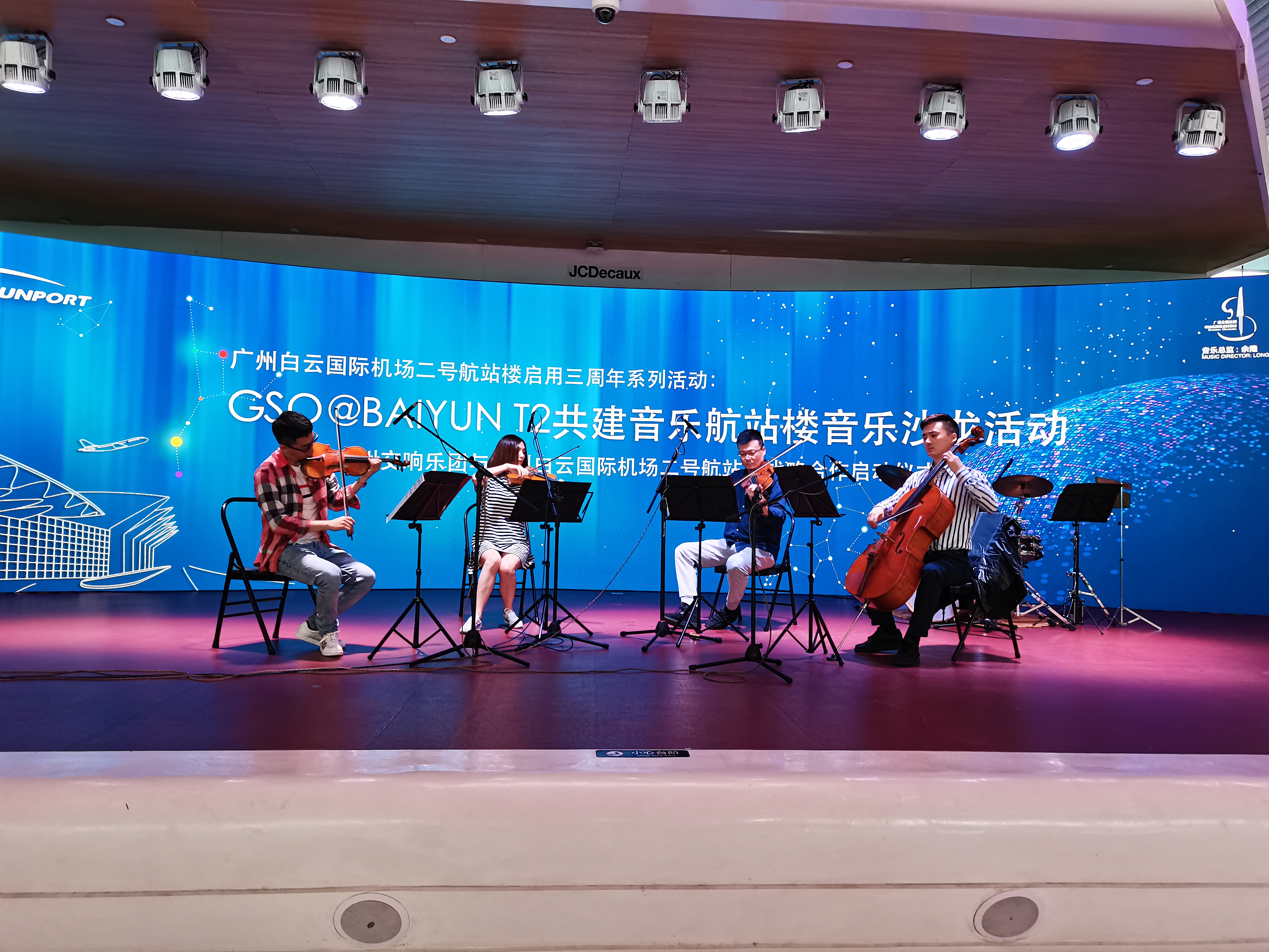4月26日,是白云机场二号航站楼启用三周年的日子。当天下午,在T2天空舞台举办了GSO@BAIYUNT2共建“音乐航站楼”战略合作启动仪式。