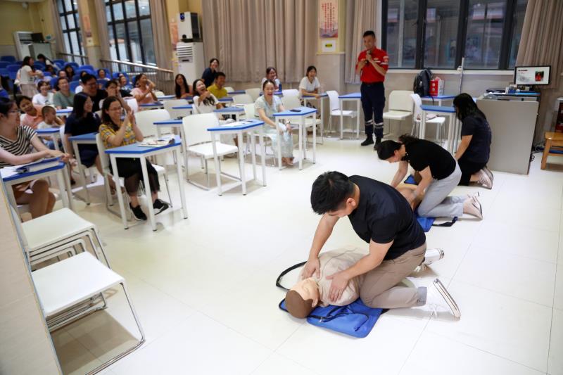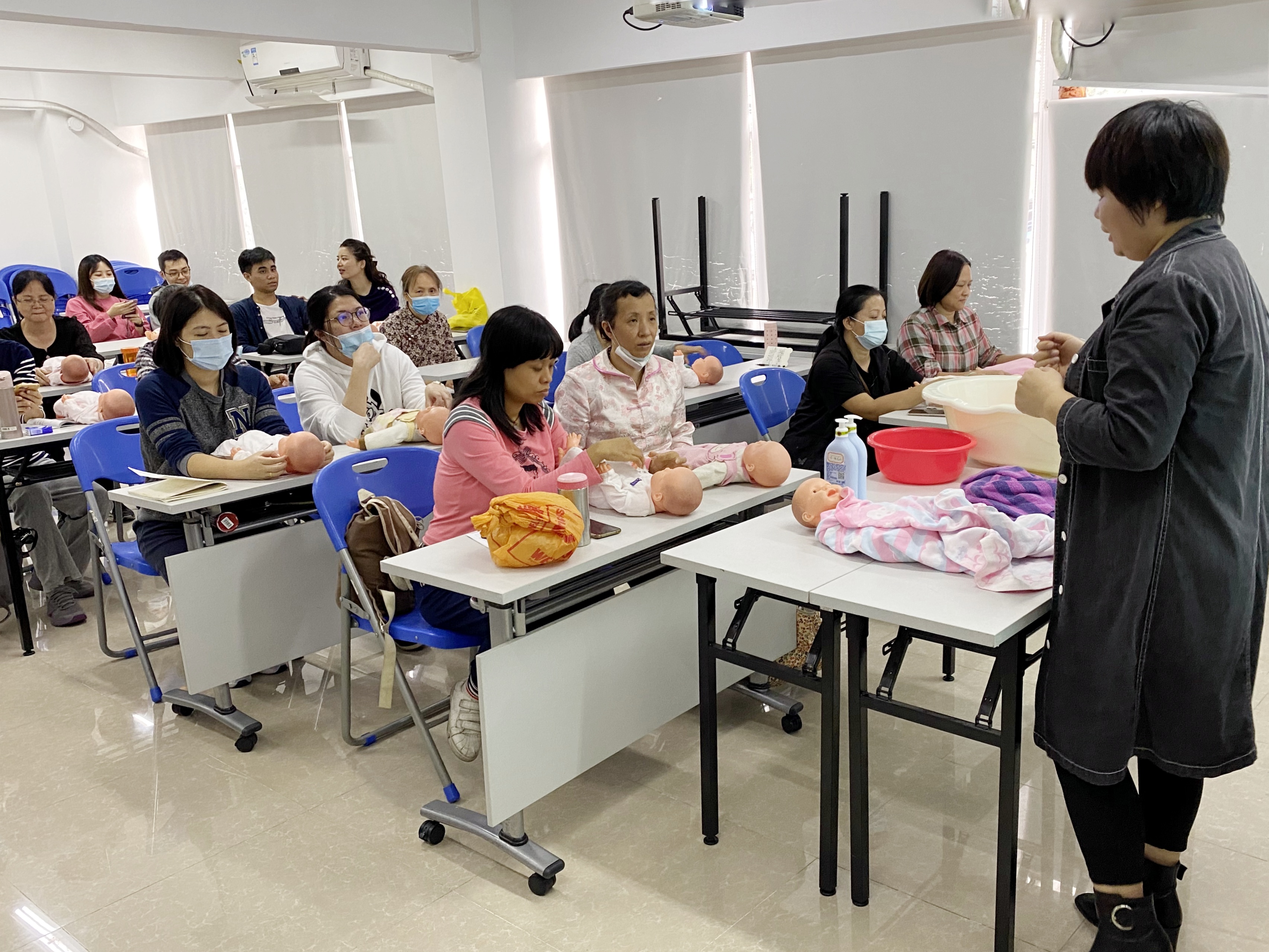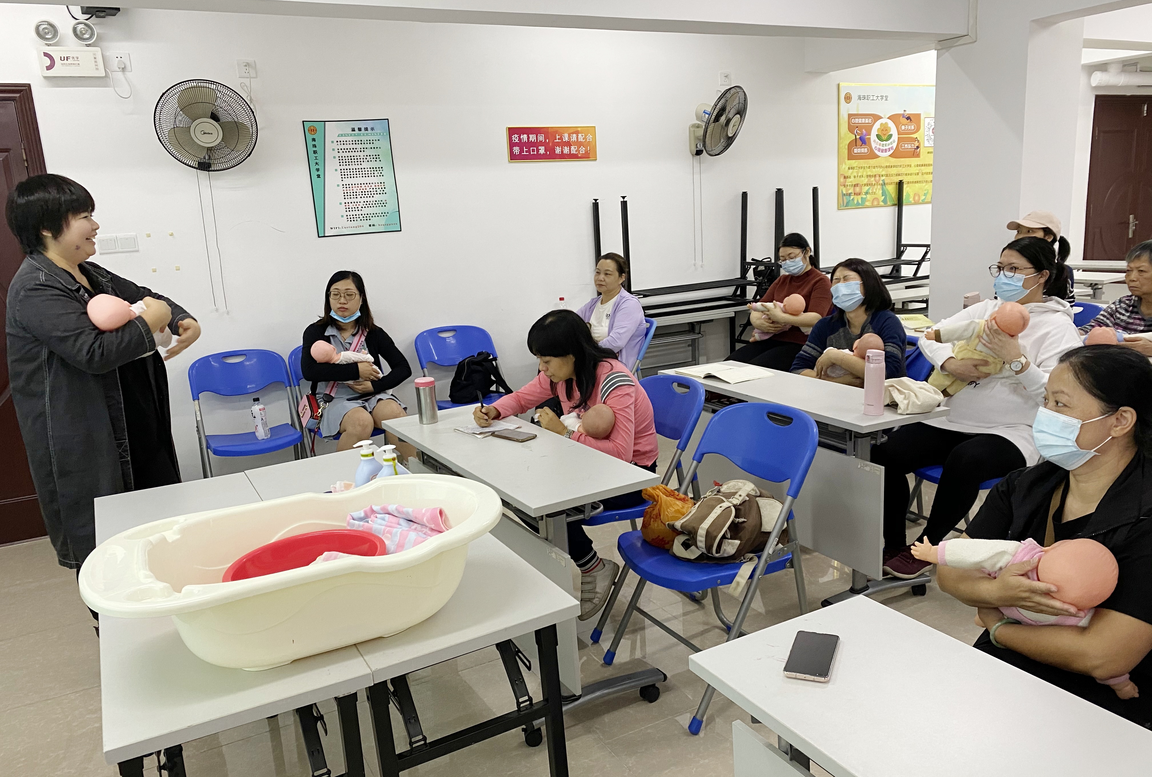 除了家政课程,母婴护理课程也广受欢迎。与职业培训不同,报名参加这个课程的大多数是育龄女职工,而且还带上丈夫或者妈妈婆婆,当中既有新手妈妈,也有准二孩妈妈。林女士说,“多年前生大宝的时请了月嫂,二宝不准备请了,打算自己和婆婆带,所以跟老人一起来上课,既是复习,也学到了很多专业知识和手法,很有收获。”新手妈妈和爸爸们更是积极,一边实操一边拍摄视频做笔记。