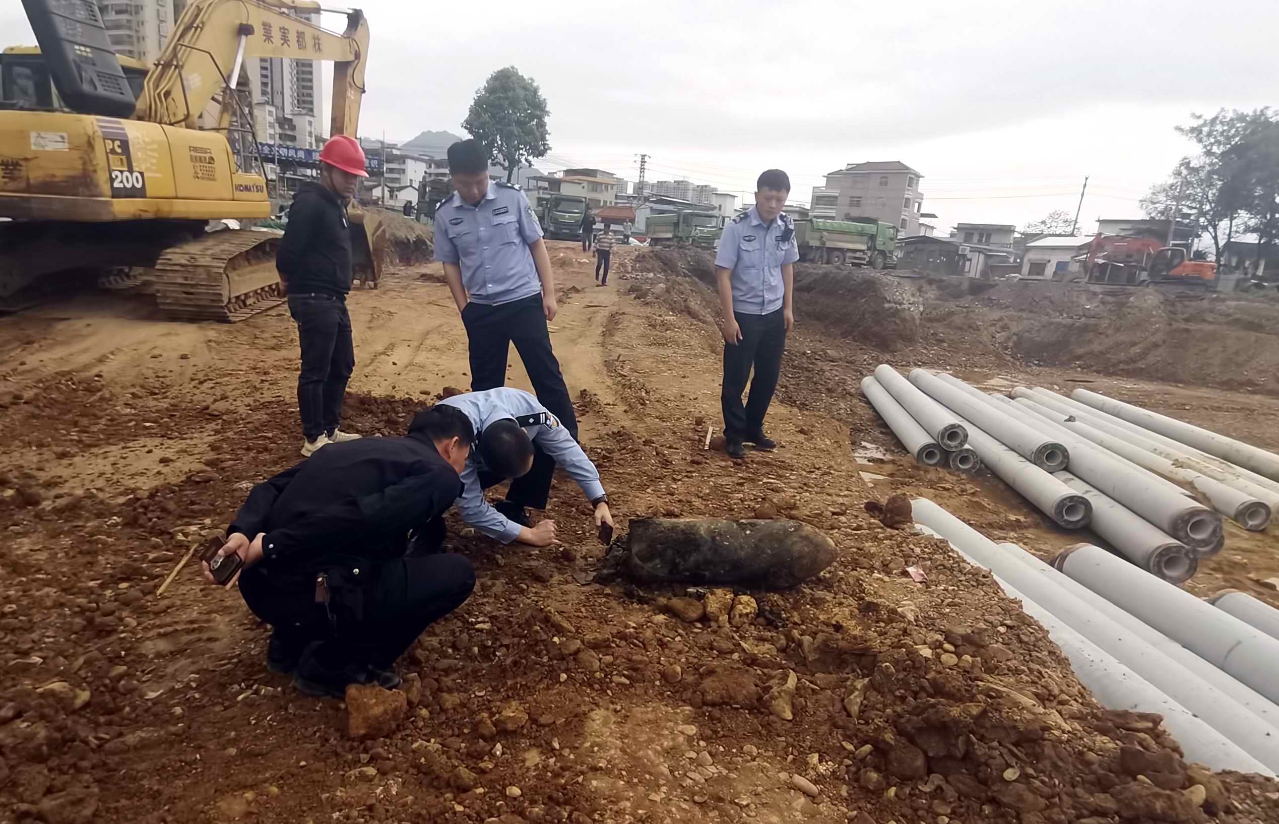 4月25日16时30分,乐昌市公安局接群众报警称,在乐昌市某建筑工地施工现场,挖掘出一枚“大铁棒子”,疑似炮弹。