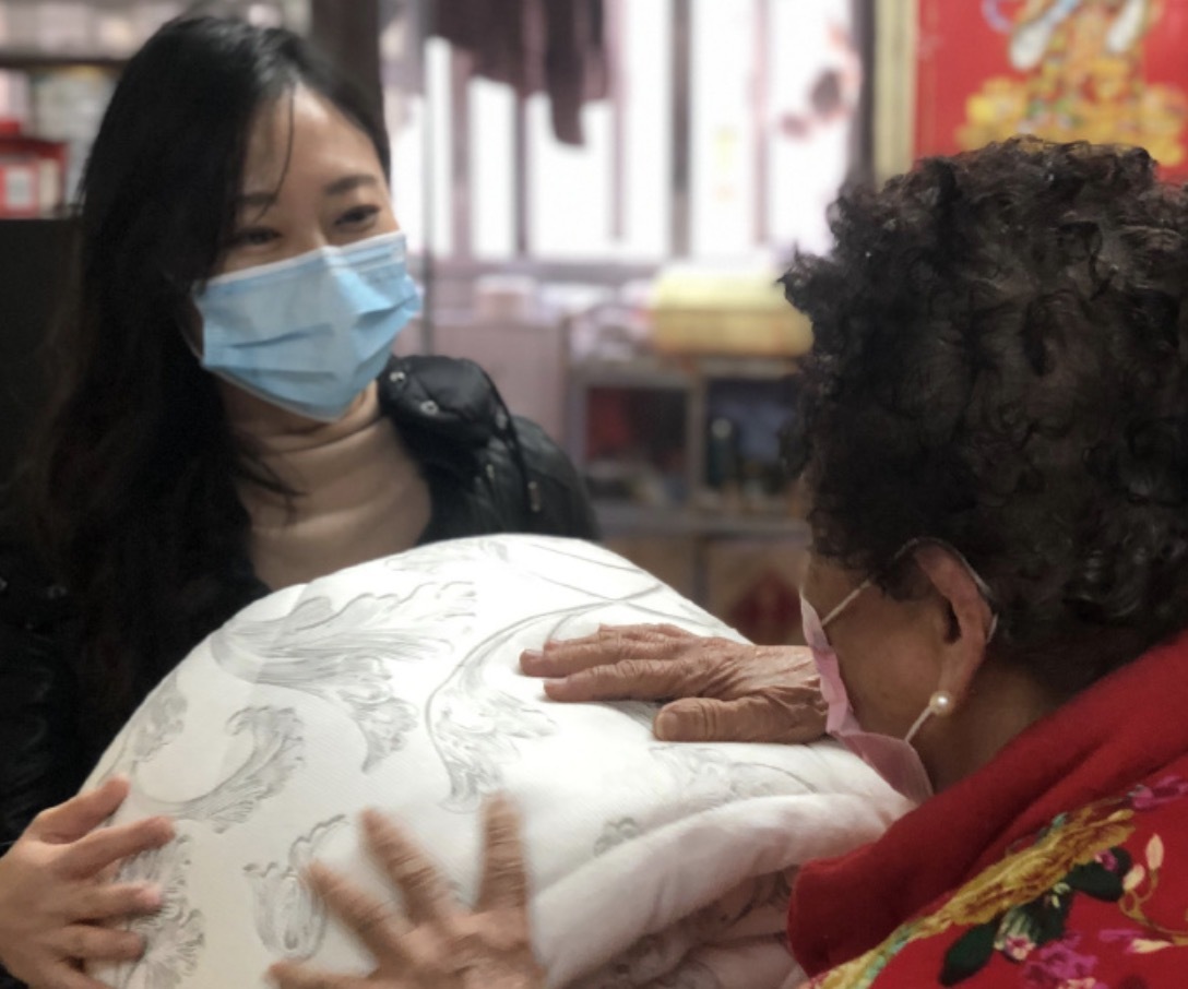 陳穎欣為街坊送去棉被。