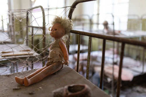 2019年11月12日,在乌克兰北部的切尔诺贝利核电站隔离区,一个洋娃娃被摆放在废弃的幼儿园内。新华社记者白雪骐摄