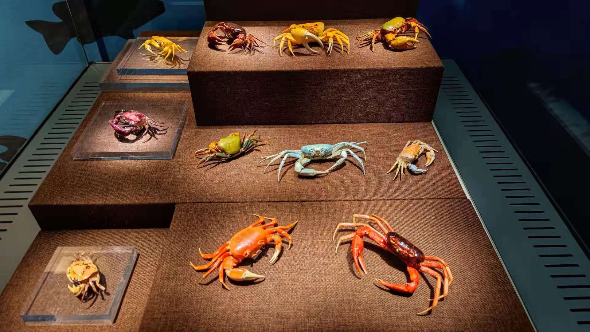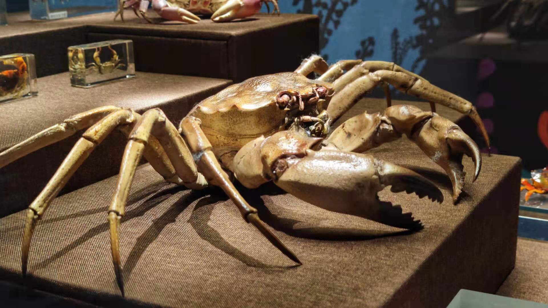 展览里还展出了世界上最毒的螃蟹——绣花脊熟若蟹。它全身长满红白相间的网状花纹,所以又被称为马赛克蟹。还有著名的能啃动椰子坚硬外壳的椰子蟹,可以直立行走的短指和尚蟹,能倒着走的蛙蟹等等。