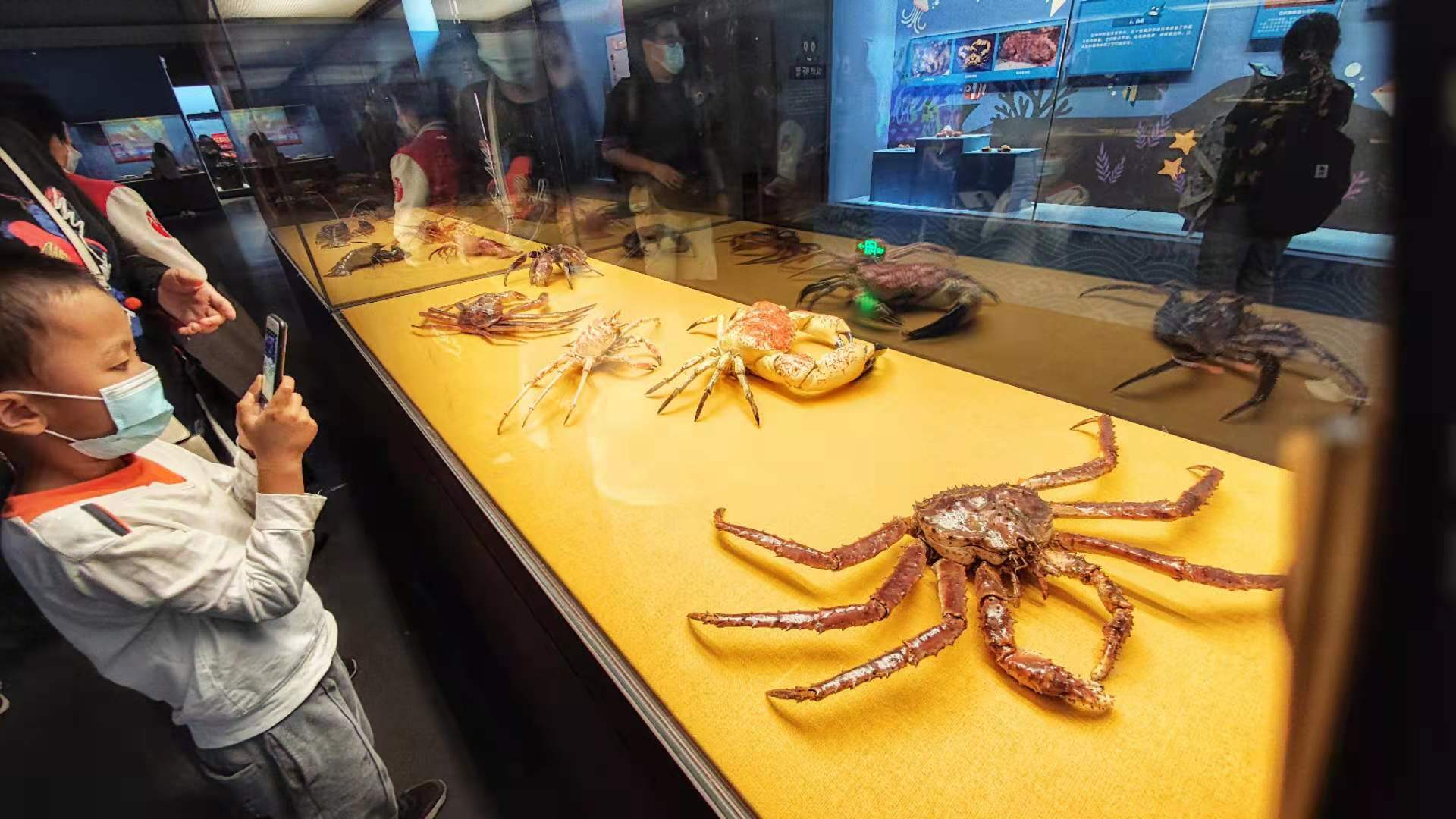展览中展出了许多难得一见的珍贵品种,比如生活在澳大利亚西部的天鹅龙虾(即西澳龙虾),有着粗壮的头胸部、坚硬的外壳和斑斓的色彩;美洲螯龙虾,第一对螯特别巨大,像“奥特曼”里的外星怪兽——美洲螯龙虾又称波士顿龙虾,但实际上它和龙虾是两种完全不同的物种;“蓝色帝王蟹”生活在寒冷的深海,体型巨大、肉质美味,但它们也并不是真正的螃蟹,而是寄居蟹的亲戚;不过另一种俗称“皇帝蟹”、最大的重量可以达到10公斤的巨大拟滨蟹,则是货真价实的螃蟹,也是世界上最大的螃蟹之一。