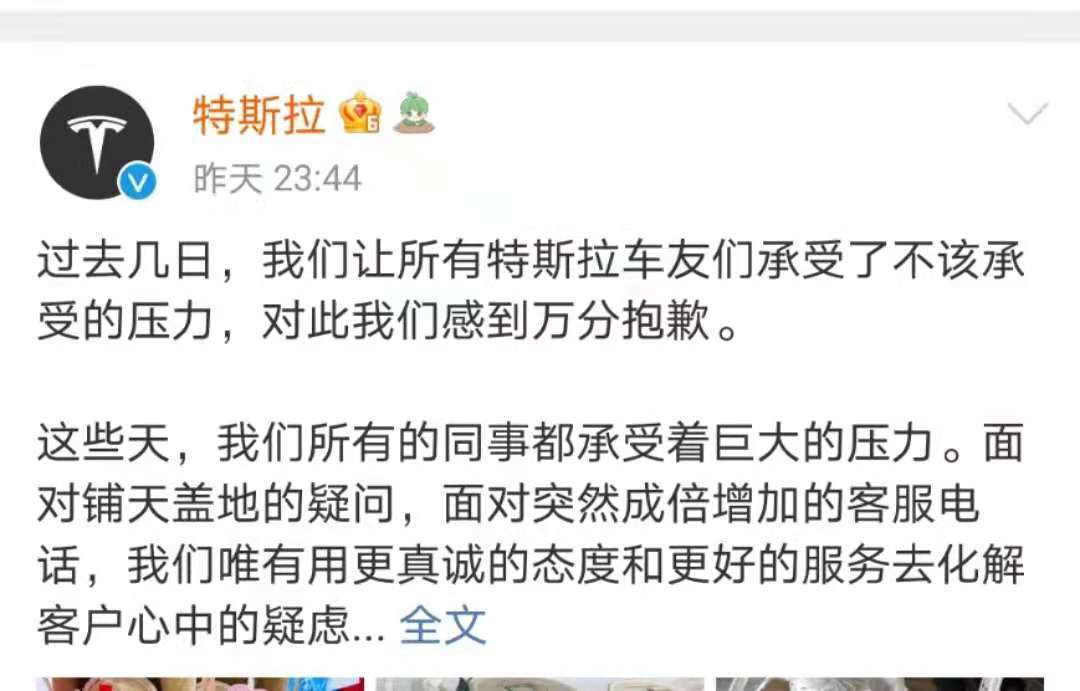 特斯拉在官方微博账号中再度致歉表示:“这些天,我们所有的同事都承受着巨大的压力。面对铺天盖地的疑问,面对突然成倍增加的客服电话,我们唯有用更真诚的态度和更好的服务去化解客户心中的疑虑。”