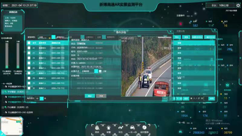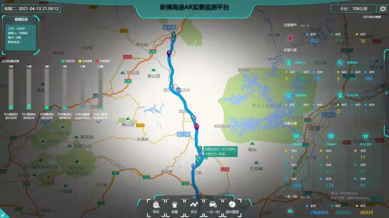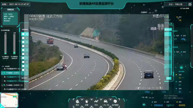 新博高速全长108公里,全线共设有500多个监控摄像,然而监控中心大屏最多同时监控54个分屏的画面,传统人工轮巡监控视频的模式难以实时发现路面异常事件,AR实景监测平台的投入使用便解决了这一问题。
