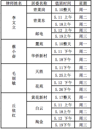 华乐街各社区律师2021年5月的值班时间表