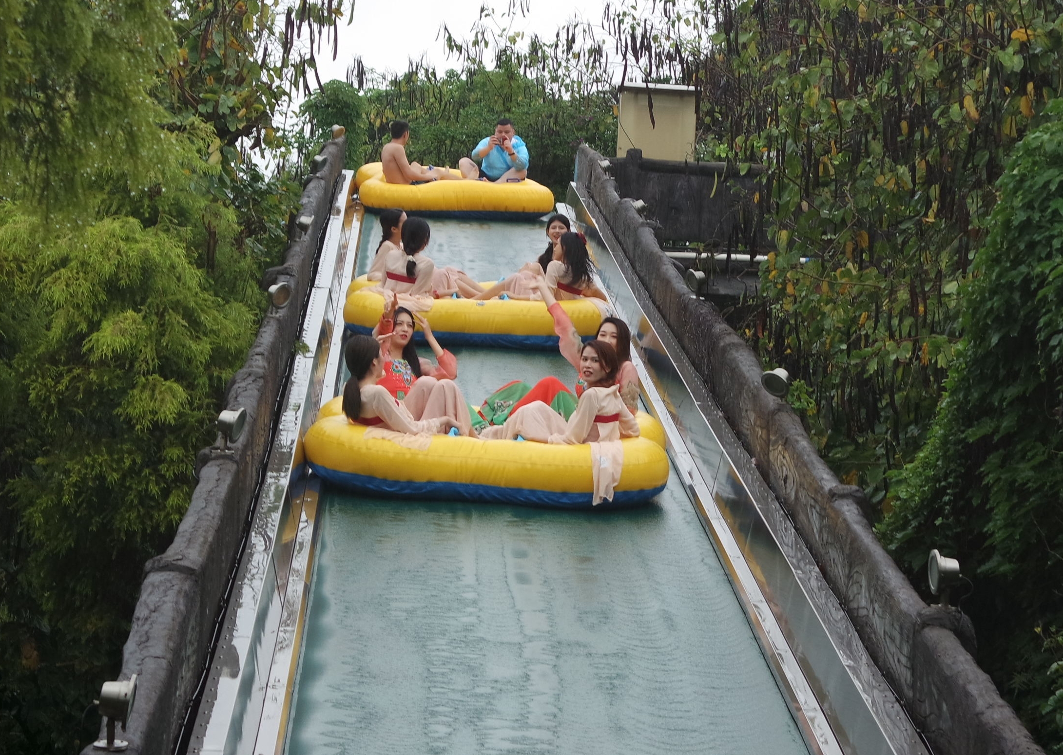 选手们还体验了园区全新升级的“冰河历险网红漂流”,项目全长1500米、高差近30米,皮划艇通过一段“船往高处游”的另类逆漂,一路穿越冰河隧道和冰川遗址风情,邂逅恐龙、巨蛇、蜘蛛、巨蛙出没的亚马逊丛林秘境,最后在风情万种的紫藤花海长廊中穿梭而下,感受一段穿越时空的浪漫旅程。