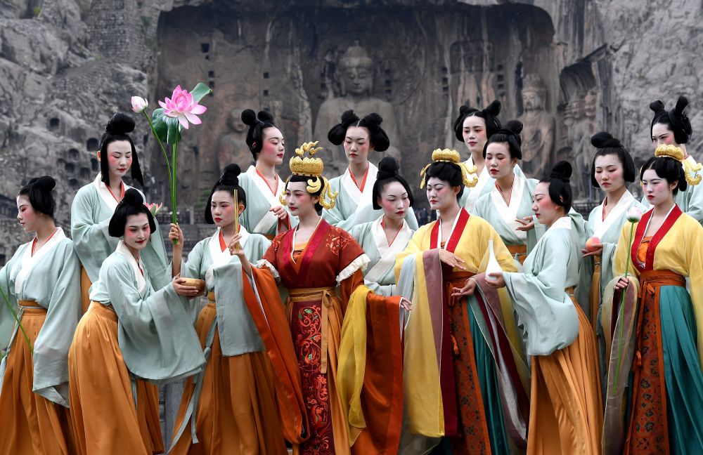 演员在洛阳龙门石窟景区礼佛台演绎《文昭皇后礼佛图》(4月25日摄)。新华社记者李安摄
