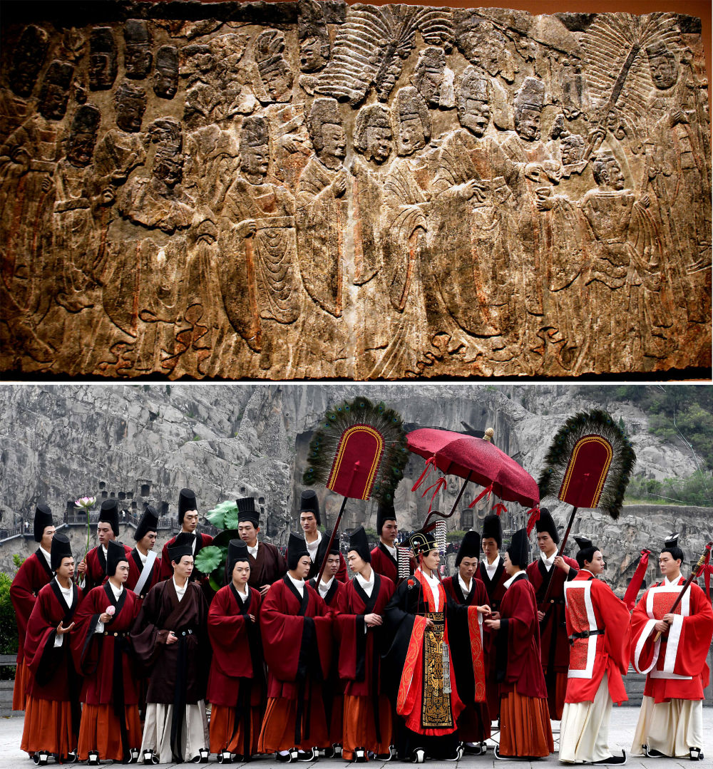 上图:现收藏于纽约大都会艺术博物馆的《魏孝文帝礼佛图》(资料照片)(龙门石窟研究院提供);下图:演员在洛阳龙门石窟景区礼佛台演绎真人版《魏孝文帝礼佛图》(4月25日摄),新华社记者李安摄。