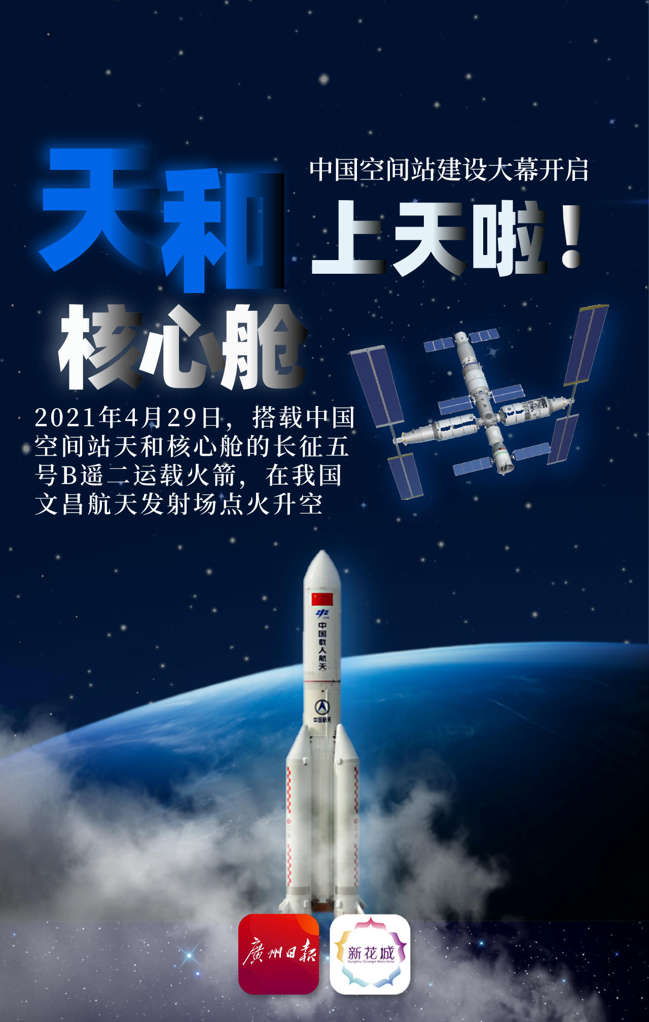 2021年4月29日,长征五号B遥二运载火箭在中国文昌航天发射场点火升空,将载人航天工程空间站天和核心舱送入预定轨道,中国载人航天工程空间站建设正式拉开大幕。
