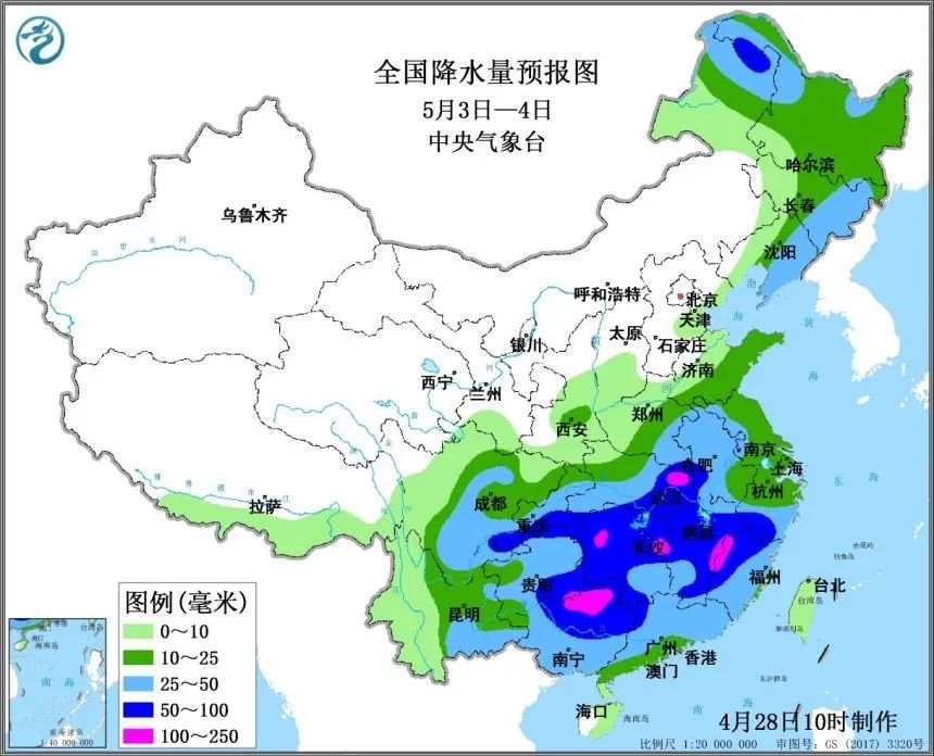 3日至4日南方地区自北向南有一次较强雷雨天气过程。黄淮及以南地区有一次大范围雷雨天气过程,江汉、江淮、江南、华南中北部及西南地区东部有大到暴雨,局地大暴雨,上述局地伴有短时强降水、雷暴大风或冰雹等强对流天气;黄淮南部及以南大部地区累积雨量有30~60毫米,湖北东部、湖南、江西、浙江南部、福建西部、广西北部等地的部分地区有80~120毫米。