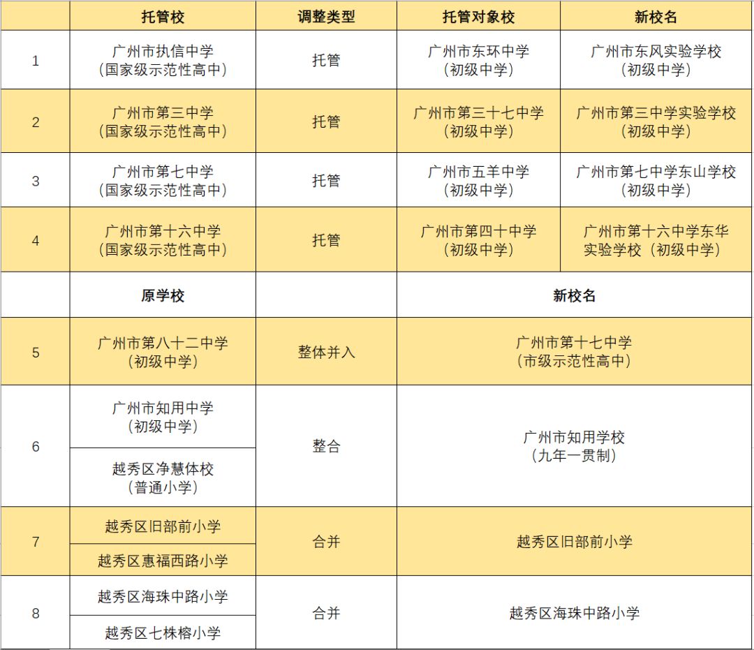 本轮调整涉及的“托管”是指由一所学校对另一所学校进行委托管理,具体方式包括如输出品牌、输出文化、派驻管理团队和优秀师资,统一教学安排和课程设置等。托管可涉及校名变更,如第七中学托管五羊中学后,撤销原“五羊中学”的校名,更名为“广州市第七中学东山学校”,保留独立法人身份不变。