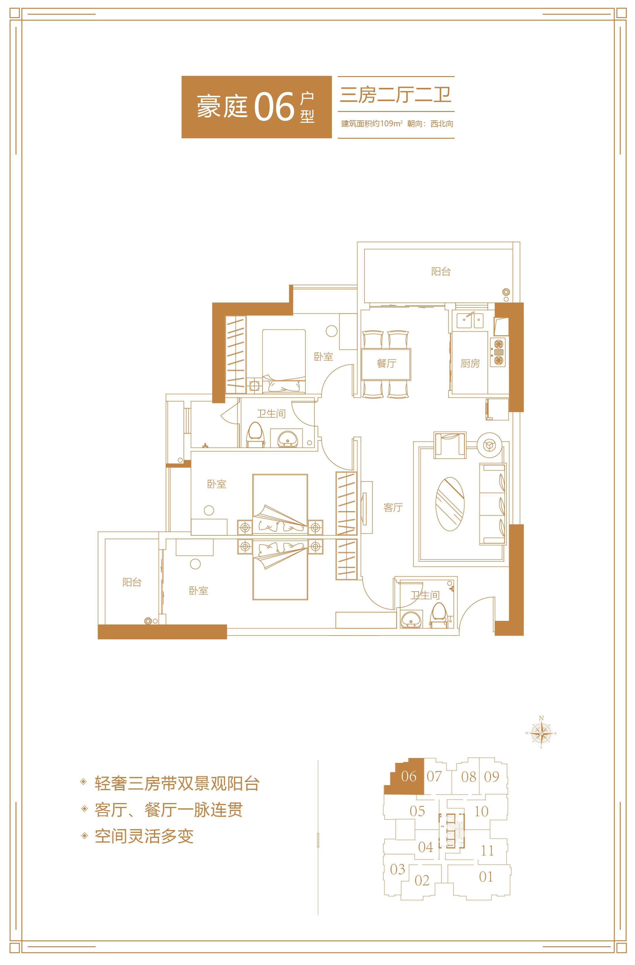 户型推荐:06三房户型该单位是建筑面积约109平方米的三房两厅两卫单位,客厅阳台可直望郁郁葱葱的白云山景,该户型几乎没有走廊位,可实现对空间的合理化利用。两间次卧和主人房卧室保持了相对独立的距离,私密性较好。主人房则是整个户型的亮点,不仅拥有独立卫生间和较宽阔的梳妆台部分,而且还有可直接步入的小阳台,夫妻两可以在这里观景叹茶,在繁忙的生活中,获得可以舒展的小天地