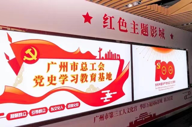 为深入开展党史学习教育,广州市总工会、珠江影业传媒股份有限公司依托位于广州市第三工文化宫的华影万晟影院,专门开辟了一个“广州市总工会党史学习教育基地”,同时,统筹安排了《红色娘子军》《地雷战》《血战湘江》《金刚川》等多部优秀红色题材影片,让广大党员和群众共同缅怀革命先辈,接受党史教育、体会红色精神。