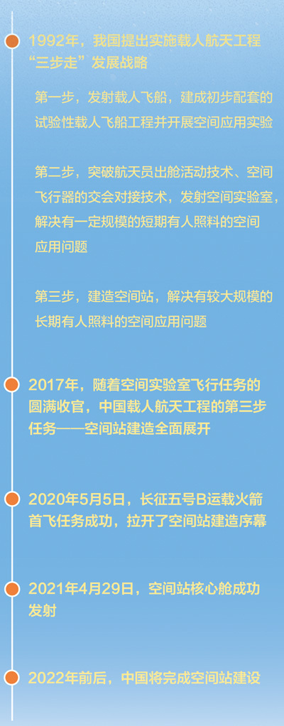 从发射载人飞船将航天员送入太空,到太空出舱、发射空间实验室,中国载人航天工程先后用6艘载人飞船、5艘无人飞船、一艘货运飞船、一个目标飞行器和一个空间实验室,支持11名中国航天员、14人次完成多趟太空之旅。环环相扣,循序渐进,正是通过历次“神舟”和“天宫”飞行任务,先后突破掌握了天地往返、太空出舱、交会对接等关键技术,为空间站铺就了一条稳妥可靠的建造之路。