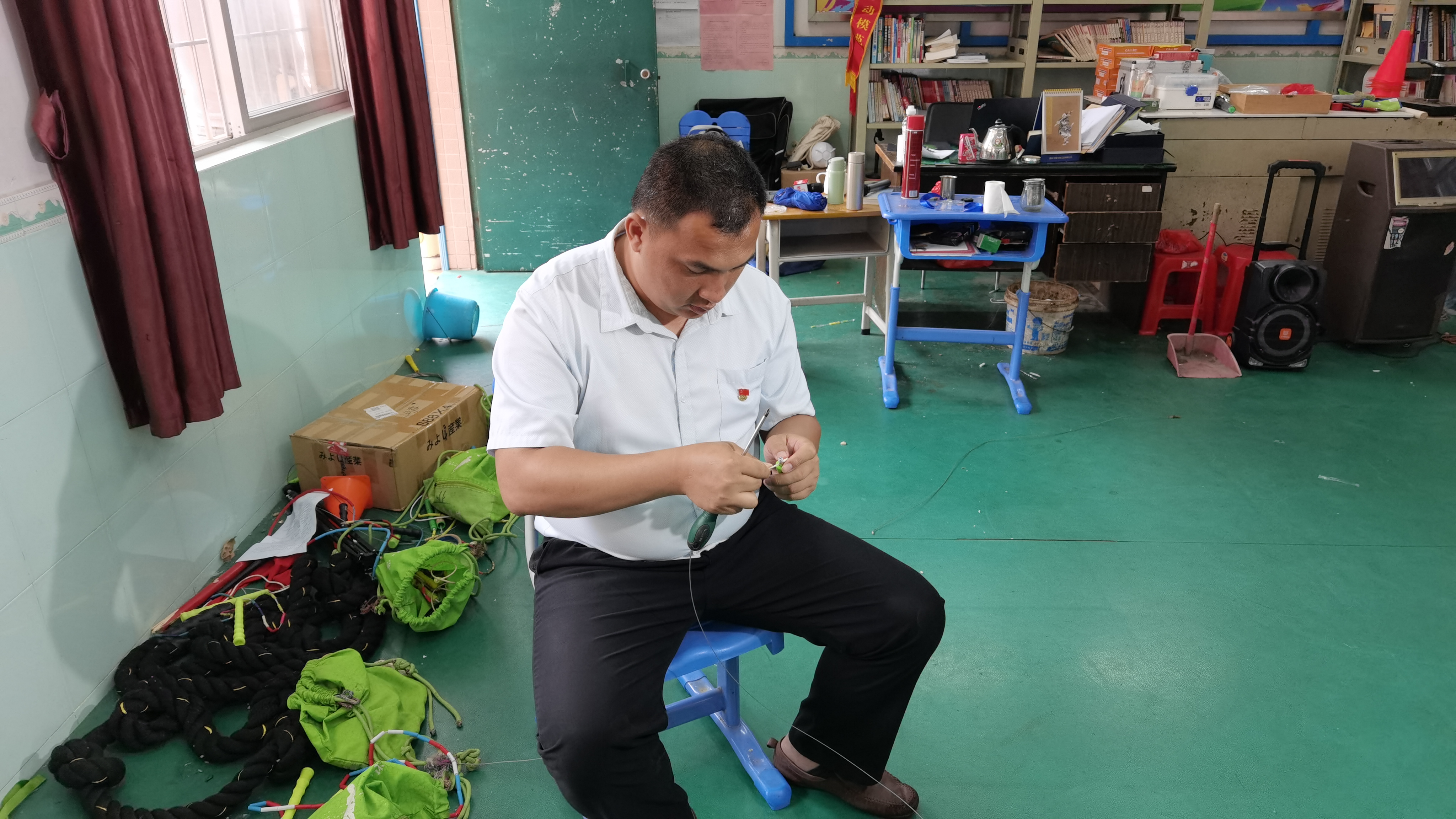 七星小学以留守儿童和外来务工人员子弟为主,由于学校办学条件差,学校体育场地、运动器材非常缺乏。为了让孩子们有一块较好的运动场,赖老师每天放学后拿起锄头就去平整学校田径场;为了让学生有学习训练用的体育器材,赖老师每天一有空闲就亲自动手去做体育器材、维修损坏的器材,他也因此被同事们戏称为“学校的后勤部长”。