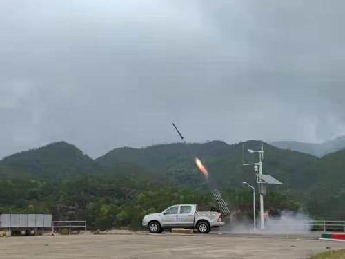 4月27日,惠东县气象局在白盆珠水库发射火箭弹人工增雨。通讯员供图