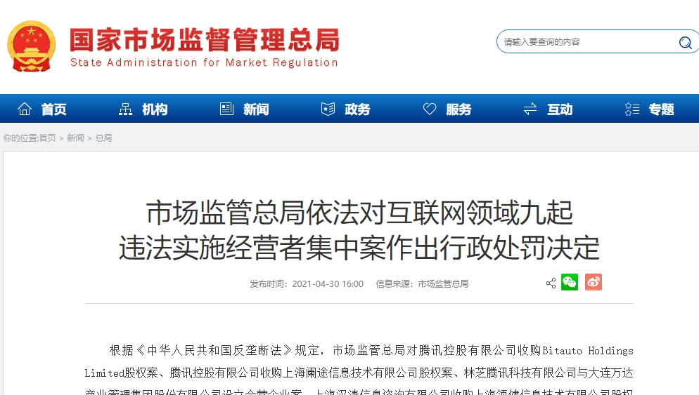 【市场监管总局依法对互联网领域九起违法实施经营者集中案作出行政处罚决定】根据《中华人民共和国反垄断法》规定,市场监管总局对腾讯控股有限公司收购Bitauto Holdings Limited股权案、腾讯控股有限公司收购上海阑途信息技术有限公司股权案、林芝腾讯科技有限公司与大连万达商业管理集团股份有限公司设立合营企业案、上海汉涛信息咨询有限公司收购上海领健信息技术有限公司股权案等九起违法实施经营者集中案件立案调查。详情>>>
