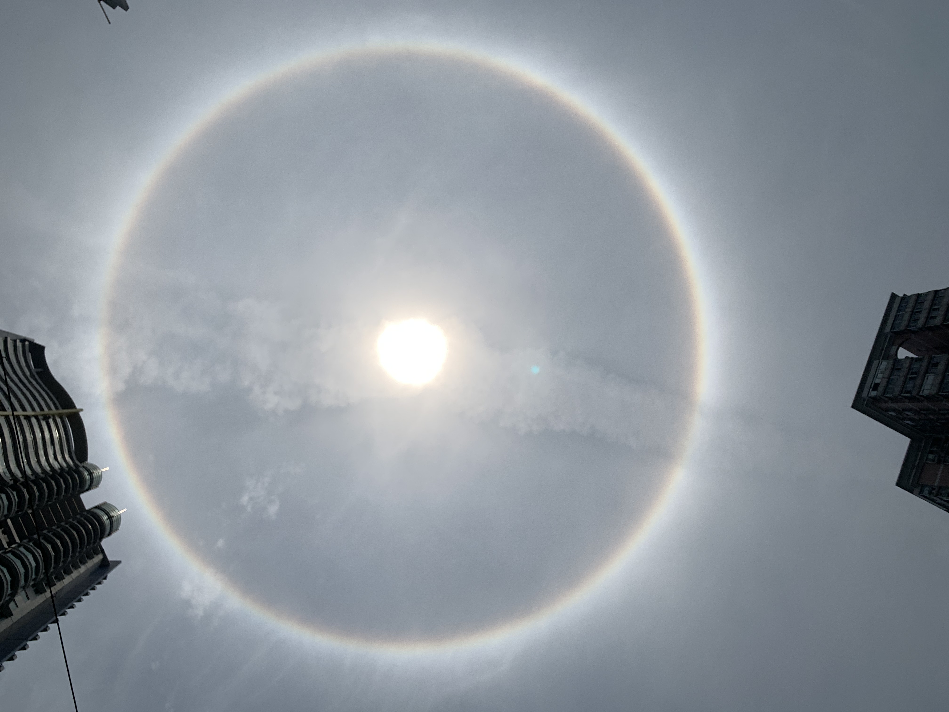【快看,日晕!】30日上午,广州美丽的日晕刷爆朋友圈(点这看美图)。日晕,又称为圆虹,是太阳周围出现的巨大彩色光环。简单来说就是高空中有卷层云,然后其中的冰晶呢被太阳光折射之后就会有日晕出现啦,至于双层的日晕则是因为冰晶的位置关系折射了两次。日晕出现,是不是意味着要变天了呢?详情>>>
