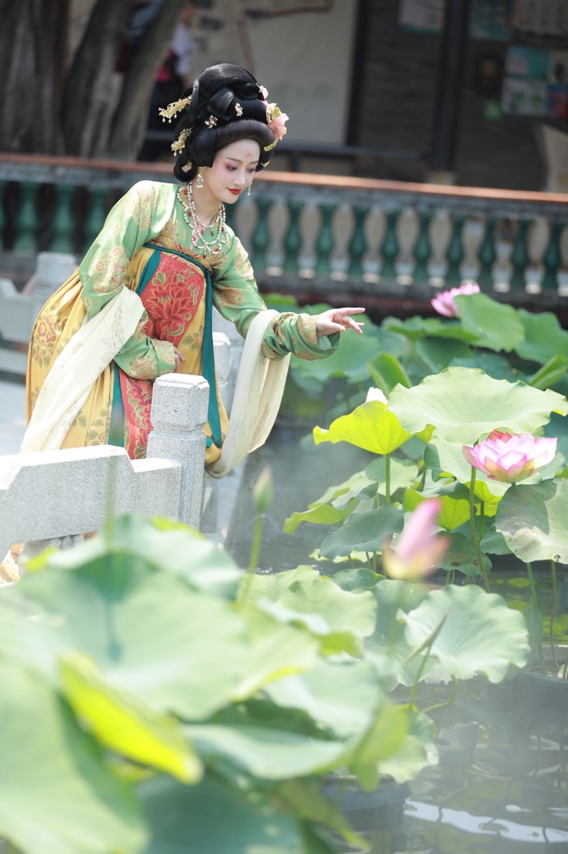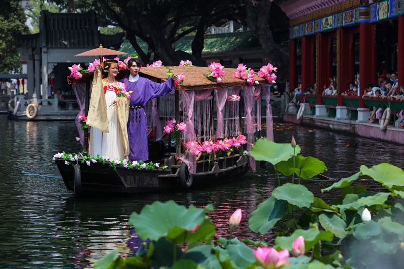当天,荔景湖上的南国花船水上巡游吸引了大批游客驻足观看、拍照。碧水红荷与岭南古建交相辉映,汉唐风韵与南国仙境相得益彰,汉服才子、佳人搭乘荷花装饰的木浆游船,在烟雾缭绕的荷塘水乡中穿梭巡游,让游客充分感受到汉文化与莲池荷韵完美融合的美景。