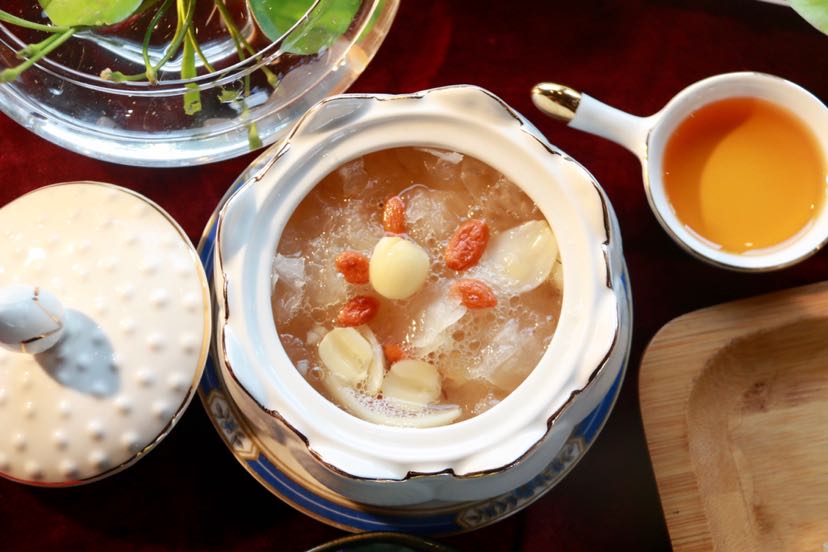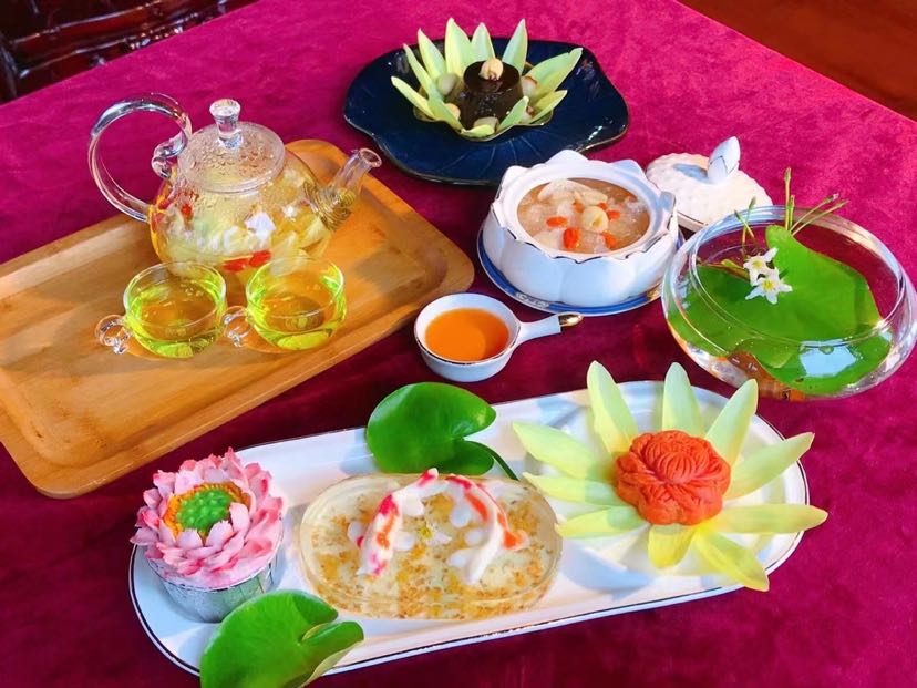荷花不止于赏,更是秀色可餐。宝墨园精心研发、以花入馔,选用荷花、荷叶、莲蓬、莲子、莲藕等为食材原料打造出荷文化系列甜品、糕点,搭配精心挑选的可食用香水莲瓣和优雅别致的莲形餐具,将锦鲤戏莲的荷塘美景融于佳肴中,让游客体验“可远观又可品赏”的美妙滋味。