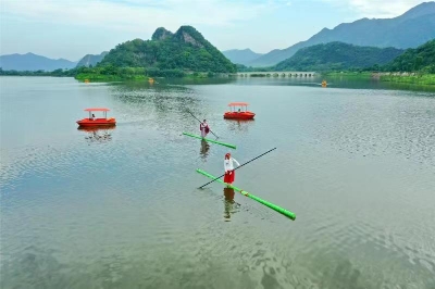 英德宝晶宫拥有1000多亩的天鹅湖资源,湖与北江连通,与喀斯特地貌山脉构成了广东罕有的湖光山色美景。五一假期,景区依托北江水域历史文化与民俗,特邀请贵州特色项目独竹漂前来表演,让广东游客一睹这项神秘的绝技。