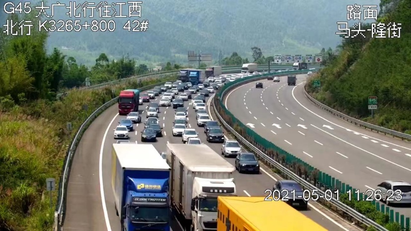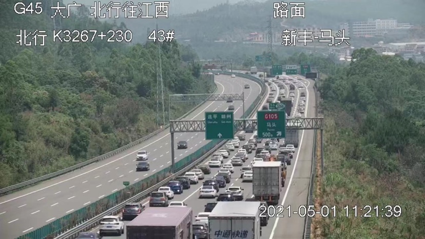 5月1日上午,广州交投大广高速迎来车流高峰,截至11时,5月1日车流已达到5.1万,较平时增长了近7倍。目前大广高速新丰至马头路段车流密集,车流仍在持续增加,大广高速建议今天出行北上江西的广大司乘朋友,可绕行105国道,避开车流密集路段,快速到达目的地。预计今天傍晚开始车流将逐步回落。