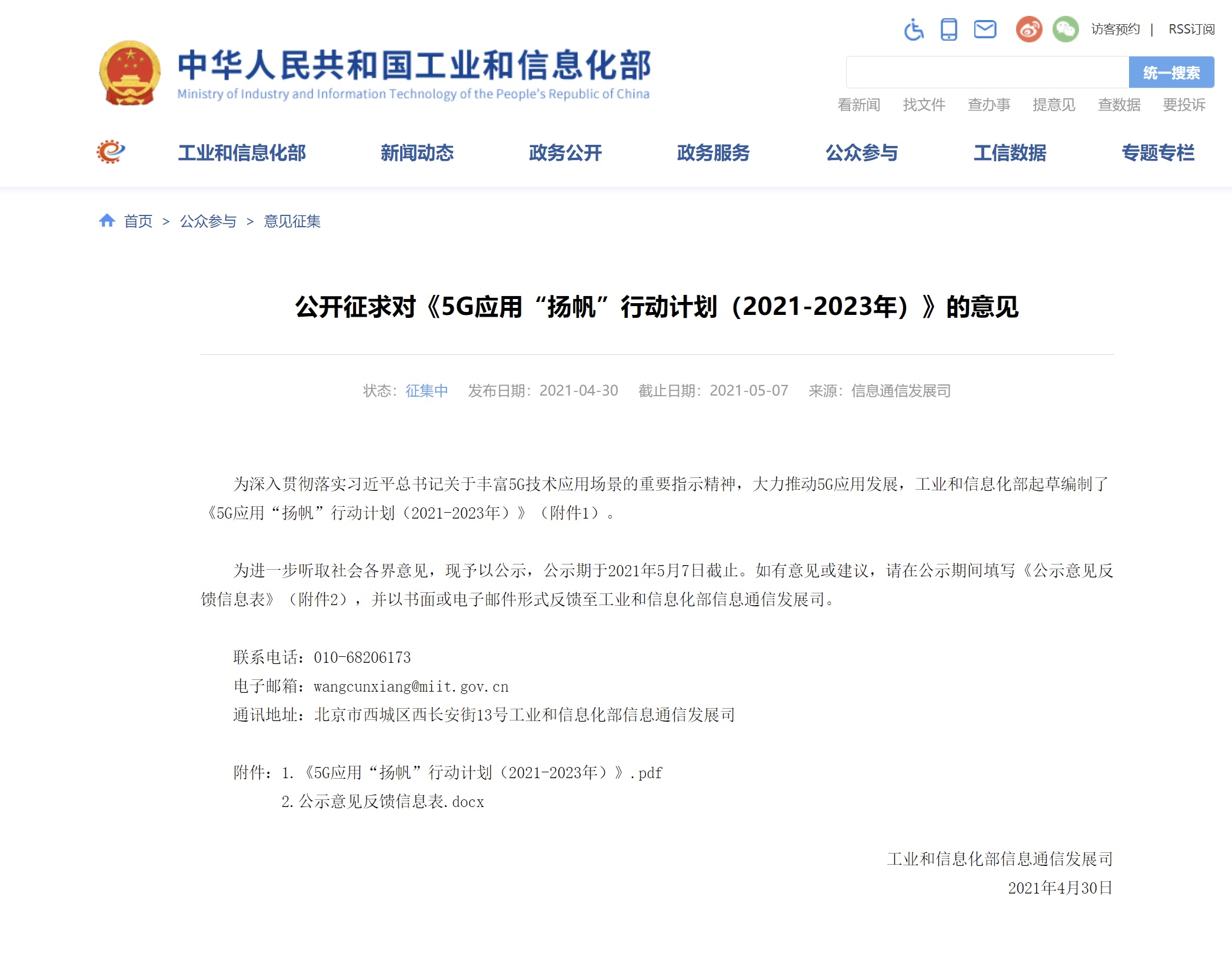 工信部起草编制的《5G应用“扬帆”行动计划(2021-2023年)》1日公开征求意见。文中提出,到2023年,我国5G应用发展水平显著提升,综合实力持续增强,5G个人用户普及率将超40%,用户数超过5.6亿。