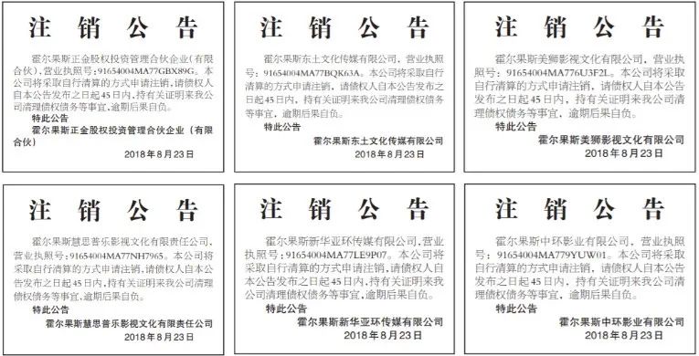 仅在2018年8月27日一天,《伊犁日报》就刊登了25家公司注销公告。该媒体统计,2018年,102家影视公司在霍尔果斯注销。