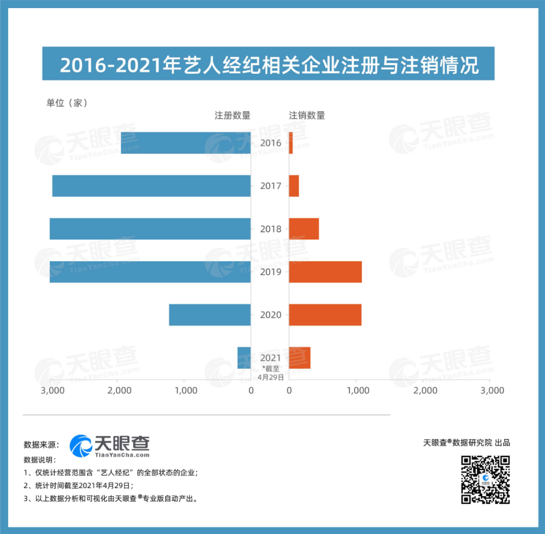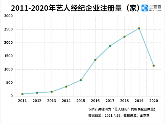 企查查数据显示,我国在业存续“艺人经纪”相关企业1.08万家。受疫情影响,2020年新增1138家,同比减少55%,2021年一季度新增147家,同比减少41%。