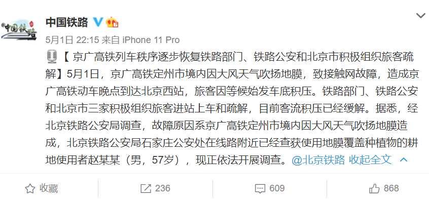 5月1日,京广高铁定州市境内因大风天气吹扬地膜,致接触网故障,造成京广高铁动车晚点到达北京西站,旅客因等候始发车造成积压。铁路部门、铁路公安和北京市三家积极组织旅客进站上车和疏解,目前客流积压已经缓解。