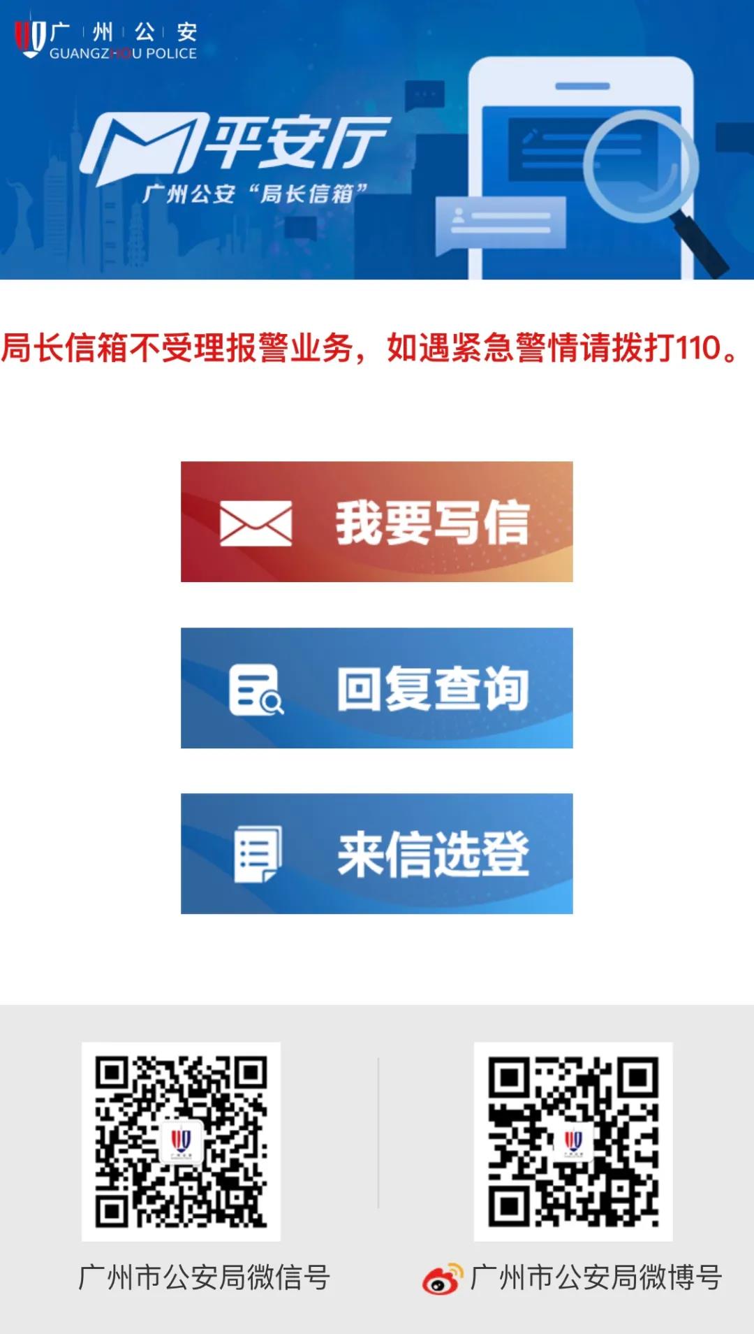 广州公安“局长信箱”在广州市公安局官方网站(gaj.gz.gov.cn)设置入口,以弹窗、飘窗等形式呈现,方便群众查找使用,同时“广州公安”微信、微博等新媒体平台也以菜单链接方式,一键跳转至“局长信箱”版块,群众可实名登录后在上述平台相关版块反映问题、举报投诉,公安机关会为来信人保守秘密。