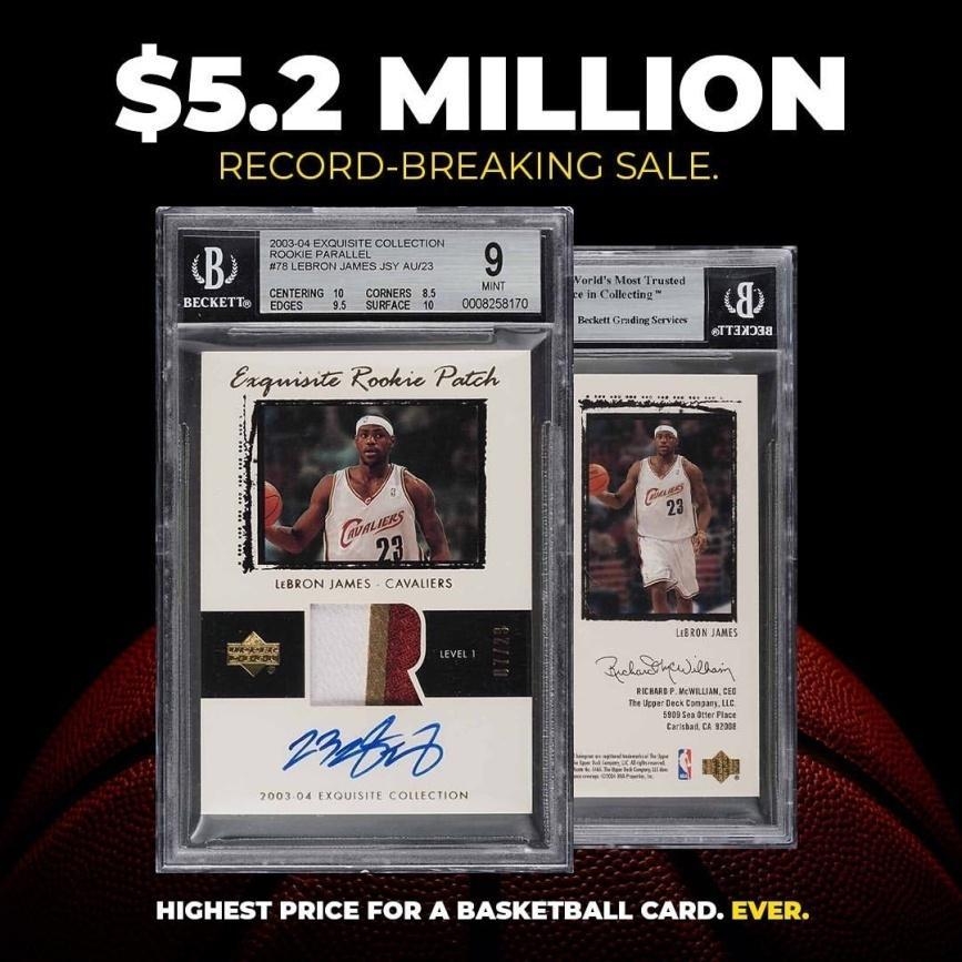 据了解,2016年9月,詹姆斯的一张限量新秀标识(logoman)签名卡(笔者注:即卡片镶嵌了球员在比赛中亲身穿过球衣上美国职业篮球联赛标识红蓝小人的刺绣裁片)以31.85万美元的价格在易贝(eBay)网站成交,这个价格当时已算天价。2020年7月,詹姆斯新秀卡创下180万美元的成交价。日前,一张勒布朗·詹姆斯新秀时期的球星卡以520万美元的高价被拍卖,追平了米奇·曼托的体育明星卡片最高拍卖价纪录。
