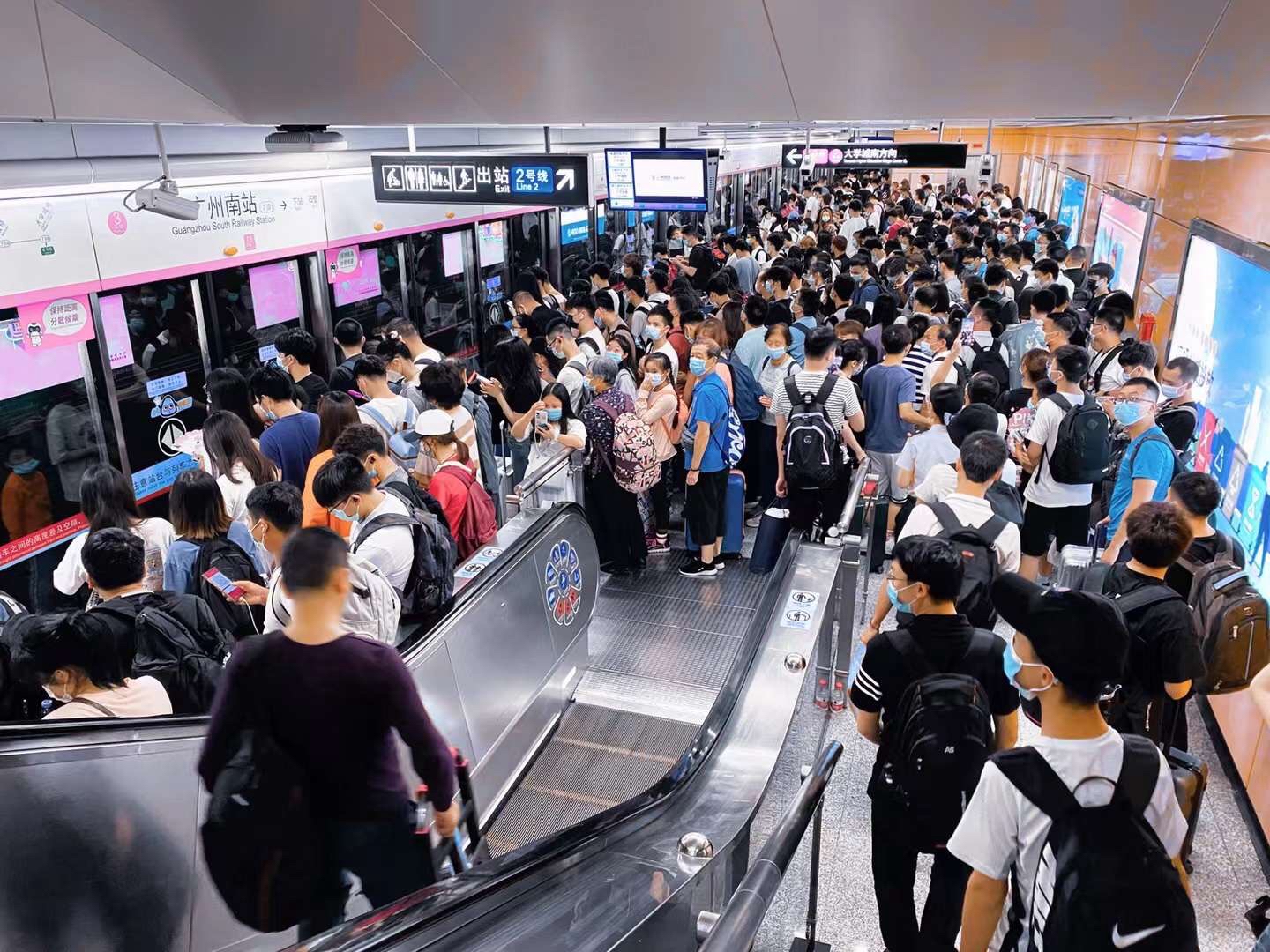 下午18时,广州地铁线网共有20个车站实施客流控制,主要集中在二、三号线。下午从广州南站下高铁的刘先生,换乘地铁七号线,看到站台上积压的客流已经塞到扶梯口。为了缓解车站客流压力,地铁采取限流措施,由广州南站进地铁的乘客,需要经过铁马阵来回绕行才能进入。