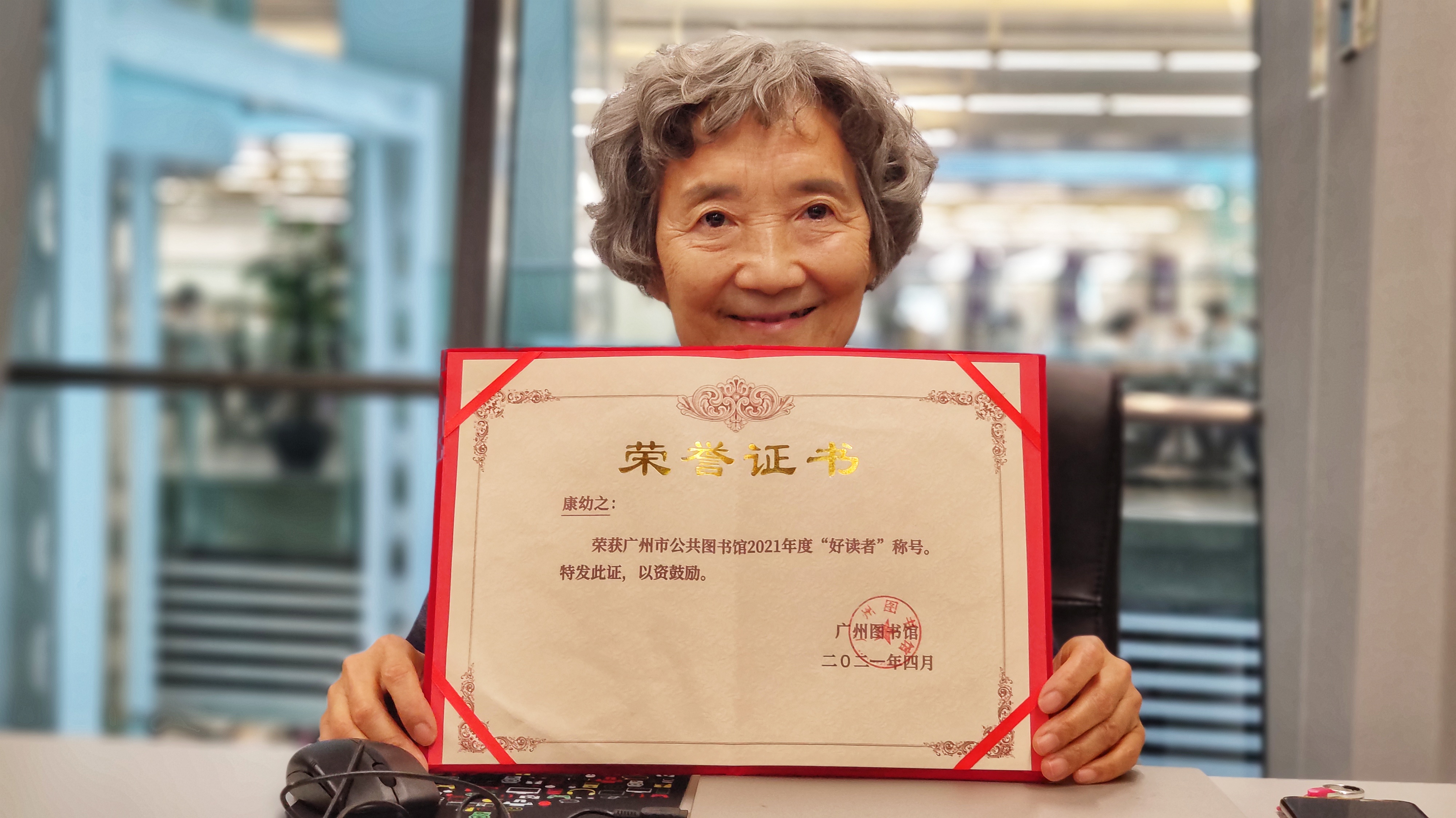 康阿姨十分珍视这份“好读者”的荣誉,因为这份证书是她弥补遗憾、不断拓展生命宽度、追求美好生活的见证,也是她幸福指数爆棚的证明。去过很多城市的图书馆,康阿姨由衷感慨:“广州图书馆最贴心,最能留住人。”