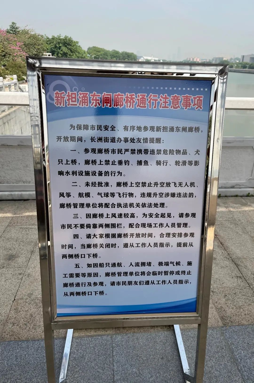 为保障市民安全、有序地参观新担涌东闸廊桥,桥上放置了写着通行注意事项的宣传牌,友情提醒各位街坊: