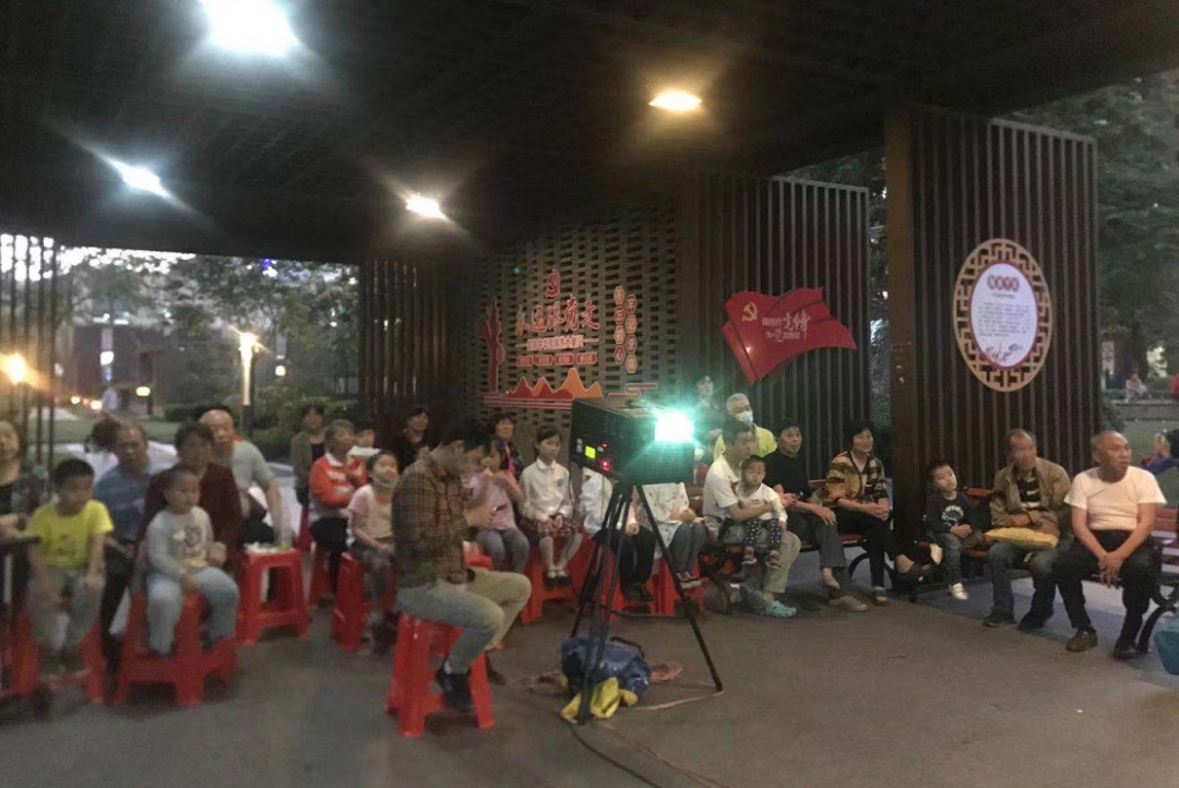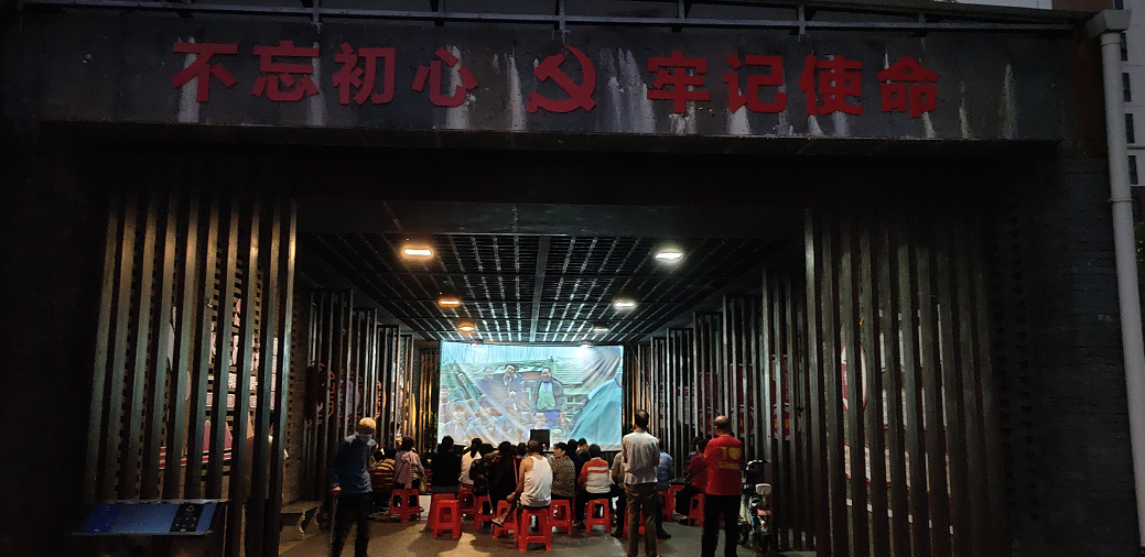 一张板凳、一块幕布,社区党员群众齐聚文化长廊看红色电影……为深入贯彻落实习近平总书记在党史学习教育动员大会上的重要讲话精神,4月29日晚,东荟城社区组织党员与群众一同观看红色影片《第一书记》。