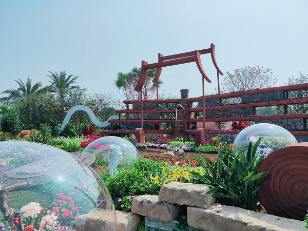 据介绍,“千年北京路 千年历史轴”作品展示北京路的古朴色彩以及表达对未来的憧憬及对过去情怀的回顾。以北京路为文化主题,以千年古道形态各异的路面砖为基本表现手法,配合铜壶滴漏、抱石鼓等北京路特色元素形成“千年北京路 千年历史轴”的主题。铜壶滴漏代表时间,不同朝代的路面砖层迭而成的路代表千年古道,突显历史底蕴的同时带领游人回顾北京路历史,看北京路故事,品鉴千年古道文化的源远流长;越秀山等元素以新型材料展示,突出了传统的魅力与现代的绚丽,让游人目睹一场古代文明与现代园艺技术在同一景观空间中碰撞的视觉盛宴。、