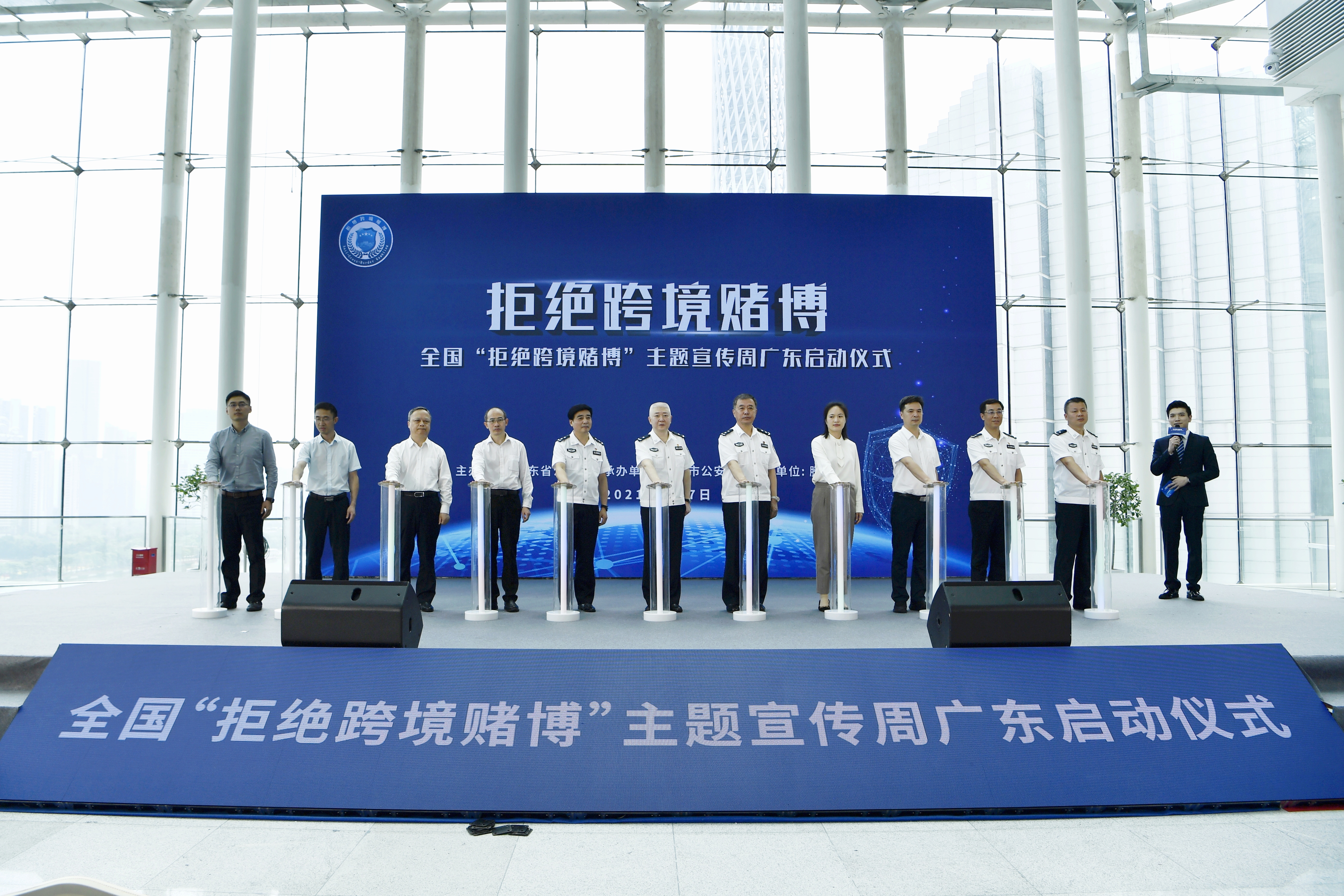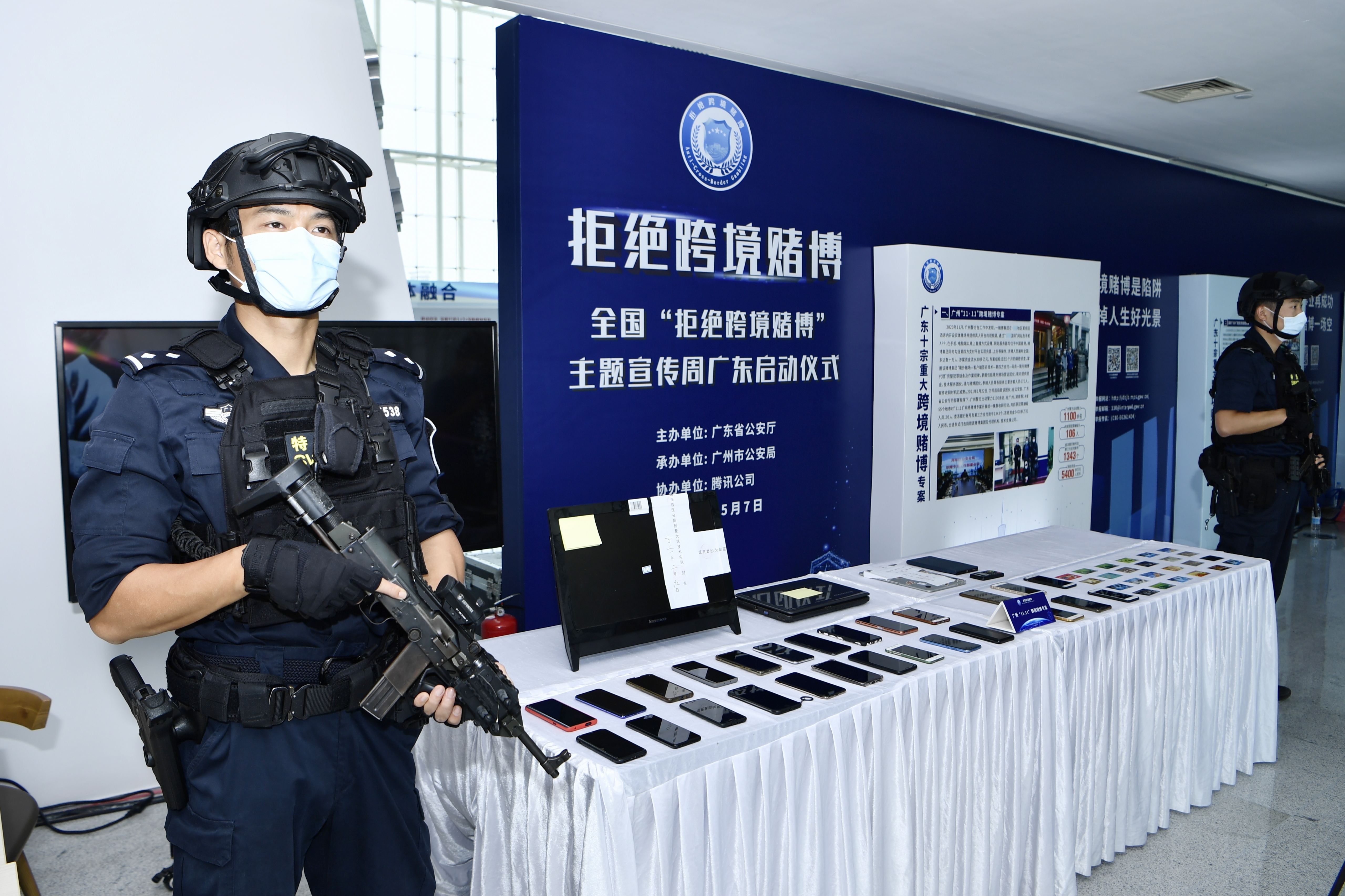 5月7日,广东省公安厅在广州举行全国“拒绝跨境赌博”主题宣传周广东启动仪式,并发布了一年以来全省公安机关打击跨境赌博犯罪工作成效和典型案件侦办情况,展示了一批缴获的涉案物品,通过宣传展板、现场咨询、以案释法、现场模拟等形式开展禁赌宣传教育,营造人人自觉拒赌、全民参与禁赌的浓厚氛围。