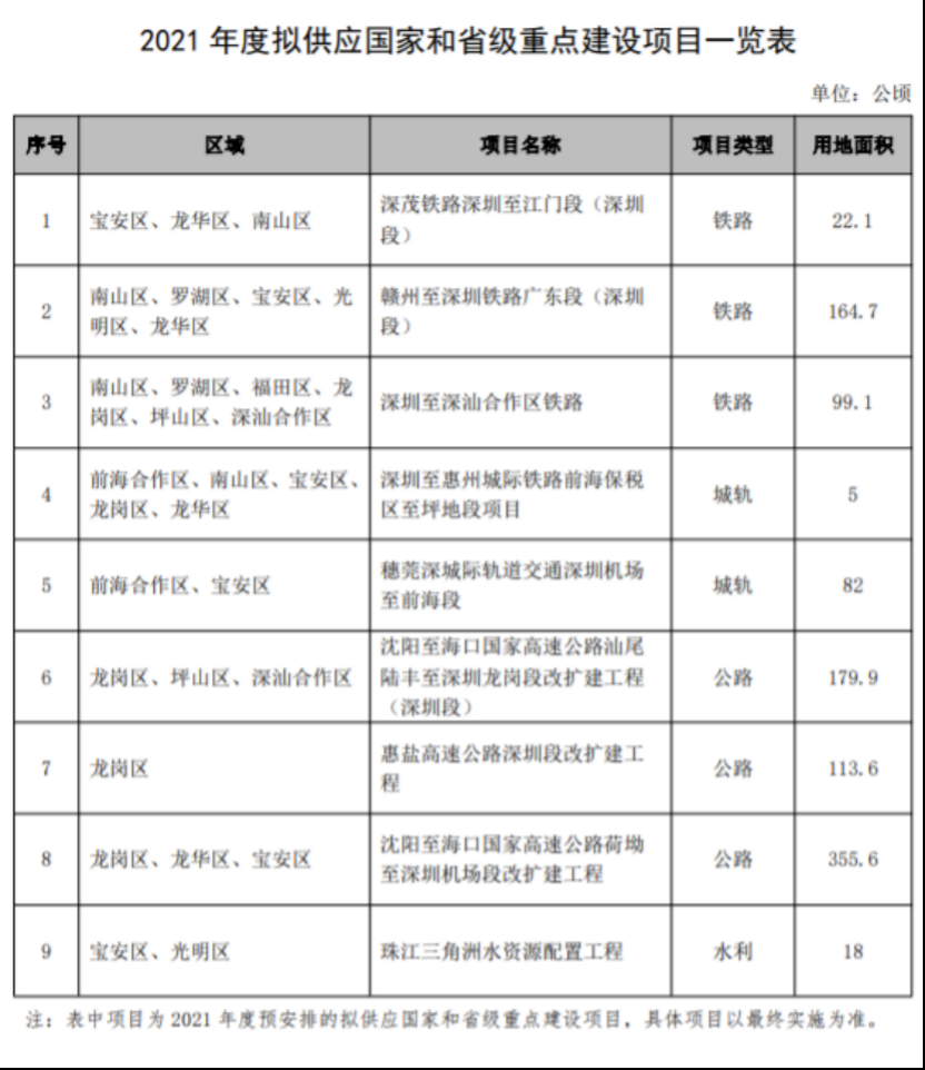 此外,在《供地计划》关于《2021年度拟供应国家和省级重点建设项目一览表》中,涉及深汕合作区深汕高铁和深汕西高速改扩建两大外联交通项目。