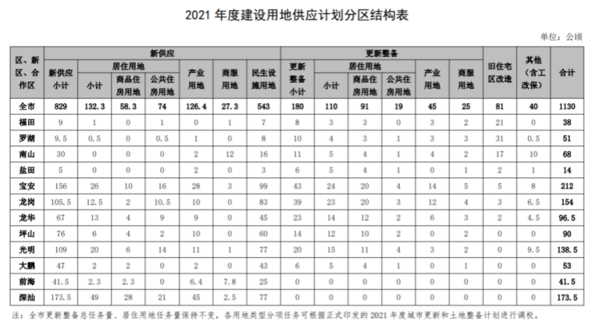 近日,深圳市规划和自然资源局印发了《深圳市2021年度建设用地供应计划》(以下简称《供地计划》),统筹协调2021年度建设用地的空间布局和时序安排。记者注意到,《供地计划》涉及深圳市深汕特别合作区(简称“深汕合作区”)多个用地事项,2021年度深汕合作区新供应用地面积共173.5公顷。