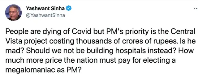 前财政和外交部长亚什万特·辛哈(Yashwant Sinha)在推特上说:“民众正在死于新冠疫情,但莫迪总理的首要任务却是中央景观项目。他是疯了吗?我们难道不应该改建医院吗?这个国家要为选举一个妄自尊大的人付出多大的代价?”