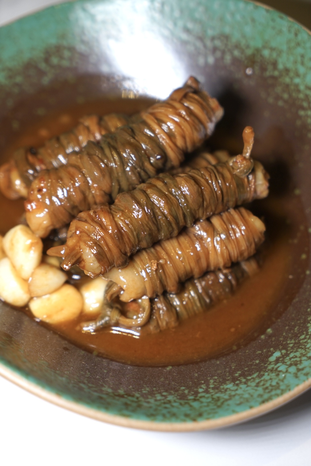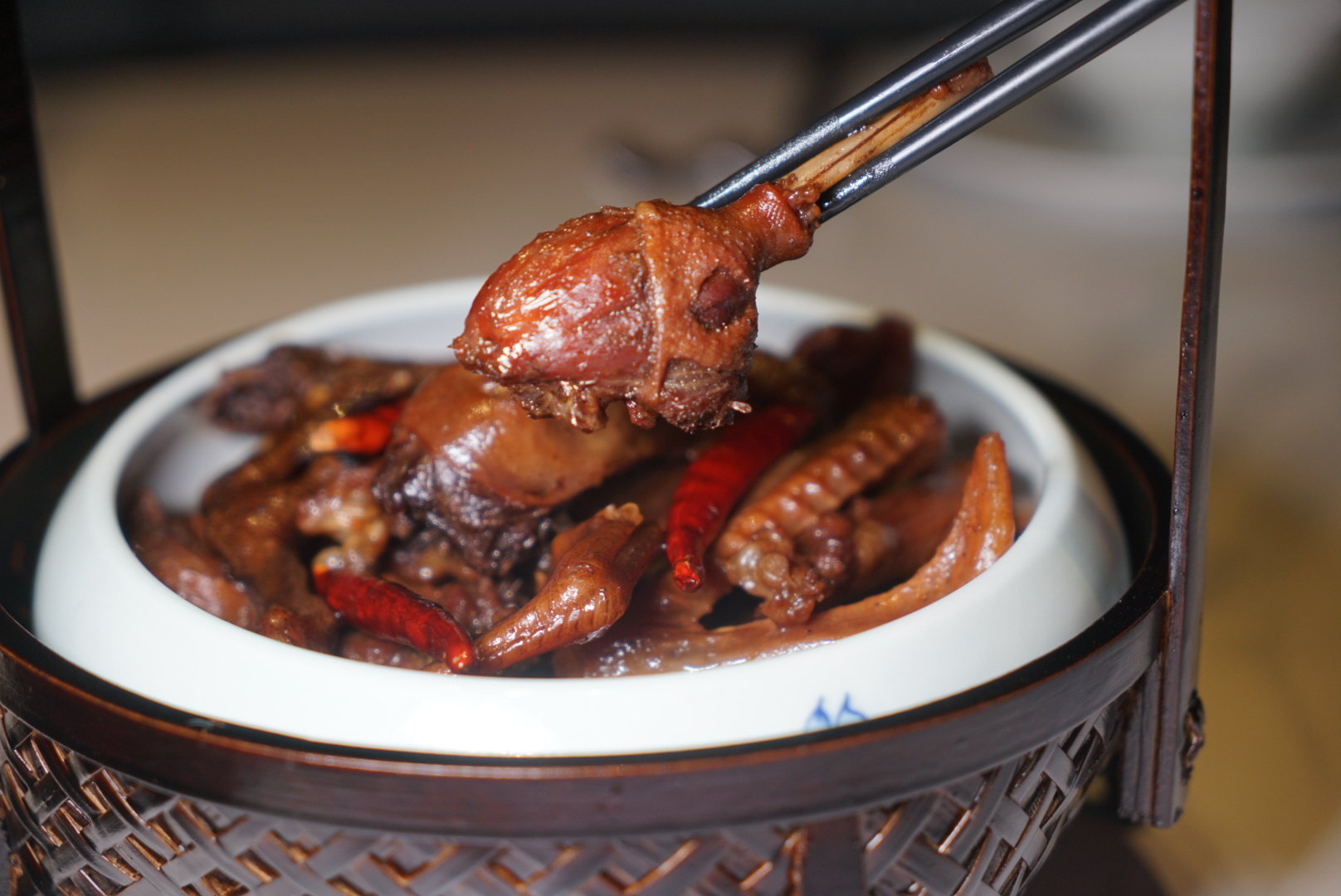 将食材精做,是祖庵菜的精髓之一。在曹弘东看来,食材无分贵贱,考究的是厨师的功夫。店内的“农家干豆角五花肉”“十八酿稻田鸭”“牛气冲天”“毛氏红烧肉”等,皆是践行着他这样的理念。“牛气冲天”选料刁钻,用的是新鲜牛头这等比较少见的食材。前期加工、后期熟制颇花功夫,光是加工就要七八个小时时间。厨师采用红煨法制作;十八酿稻田鸭真真用了十八道工序来制作,鸭子选用的是放养的稻田老水鸭,生长期达到一年以上。鸭子处理过后,要用原油脂浸泡一晚上,再做炒、炸、焖、煮,用酒鬼酒来焖煮入味,一定要用这个风味的酒来去腥味提香味,带出回甘感。18道工序中,光是炒炸焖煮就要耗时45分钟、冷了以后再浸泡上一个晚上,最后还要再蒸上40分钟,耗费时间长,绝非如今市面上的快手菜能比。如此一来,鸭子入透味,连骨头都有香味儿。