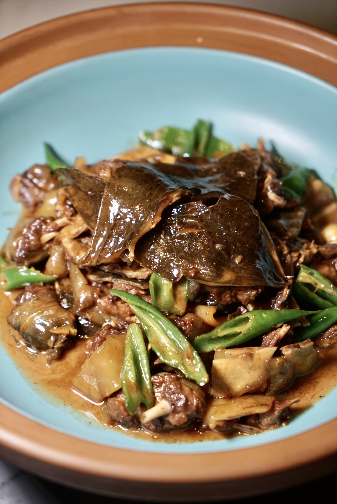 清蒸水鱼是祖庵菜菜中的一道名菜。水鱼是甲鱼的又一别称,湖南盛产甲鱼,汉寿是甲鱼之乡,相比其他地区的甲鱼,这儿的体薄片大,裙边宽而厚,腹内脂肪丰富。甲鱼也有不同分级,其中生长期达6年以上的为少数,品质也上佳。据曹弘东介绍,随小馆主要选用的是这个级别的甲鱼,通常最少也有3斤半。店内的“小馆私房甲鱼”正是从祖庵菜脱胎而来。厨师称,甲鱼的鲜要保存,尽量不用到辅助调味品,以免掩盖其味。如何让甲鱼的汤汁浓稠而有味,这对于厨师来说是最大的考验,需要有时间和火候的把控。在慢慢的熬煮中,甲鱼的香味和胶原蛋白渗透入汤中,此时,适当增加一点白酒,能带来更加香厚的风味。