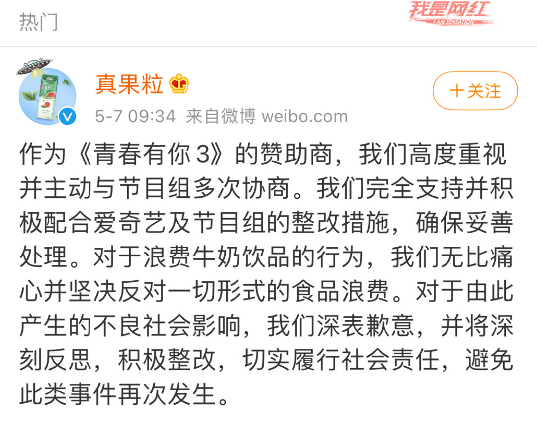 5月7日,蒙牛真果粒在官方微博称,作为《青春有你3》的赞助商,其完全支持并积极配合爱奇艺及节目组的整改措施,对于浪费牛奶饮品的行为,坚决反对一切形式的食品浪费,并对于由此产生的不良社会影响道歉。